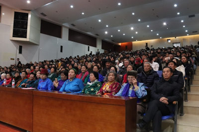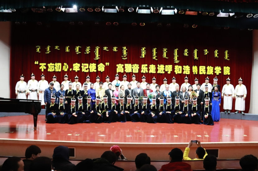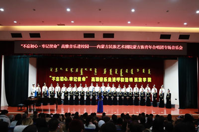 为了更好的宣传贯彻党的十九大会议精神,重温党的光辉历程,讴歌党的丰功伟绩,弘扬民族传统文化,营造高雅校园文化氛围,校团委于12月22—23日,邀请内蒙古民族艺术剧院蒙古族青年合唱团在图书馆二楼报告厅举办了两场“不忘初心·牢记使命”高雅艺术进校园活动。校党委副书记胡春梅教授出席活动,两天共计1000余名师生观看了演出。