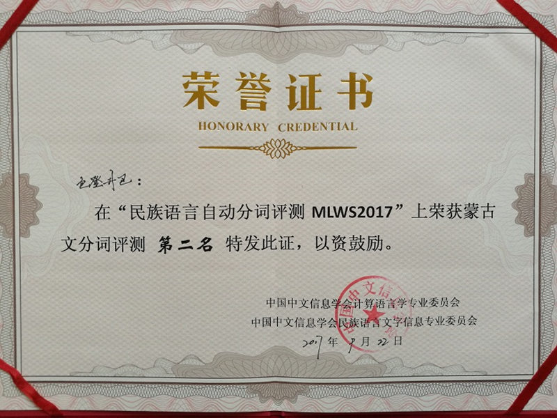 本次会议,beat365官网师生表现颇为突出:包乌格德勒副教授作了题为《蒙古文分词评测技术》的学术报告;色登丹巴等老师提交的“蒙古文自动分词实验结果”(F值为99.38)获得“少数民族语言文字分词评测”(MLWS2017)第二名;beat365官网计算机系信息管理与信息系统专业2013级学生德格吉日胡的毕业论文《蒙古文网站现状及未来发展趋势研究》被会议录用,并宣读交流。会上,中国工程院院士、新疆大学吾守尔•斯拉木教授、北京大学俞士汶教授、清华大学刘洋副教授等专家作了主题报告。