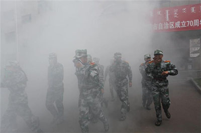 本次演练科目主要有火灾逃生、展出安全教育系列展板、消防官兵使用灭火器进行灭火、消防车水带出水演示和防暴恐安全事件演练等五项。