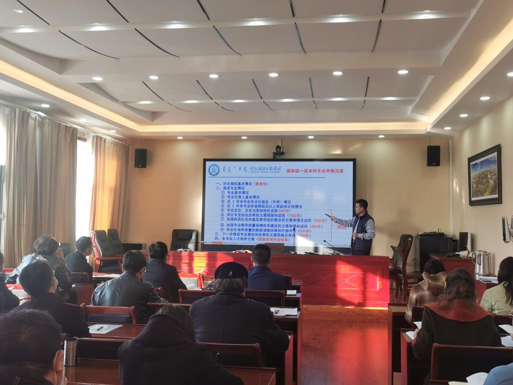 为助力一流本科专业建设点申报工作,强化专业内涵建设,提升专业建设质量,11月4日上午,学校在办公楼四楼召开2021年度一流本科专业建设申报培训会。beat365官网各二级学院院长、分管教学工作院长、部分专业负责人、教务处工作人员等共计40余人参加会议。教务处处长额尔敦布和主持培训会。