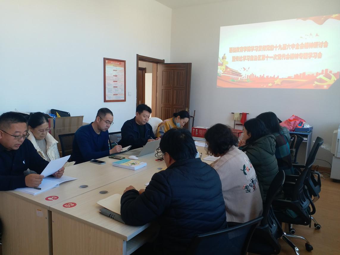 为认真学习贯彻党的十九届六中全会精神和自治区第十一次党代会精神,做好学习宣传、研究阐释工作,持续推进党史学习教育走深走实,引导广大师生汇聚起坚定历史自信、创造历史伟业的磅礴力量,2021年12月6日下午,基础教育学院党总支在崇正楼402室组织召开了党的十九届六中全会精神学习研讨会暨传达学习自治区第十一党代会精神专题学习会。会议由党总支书记常喜主持,全体教职工参与学习研讨。
