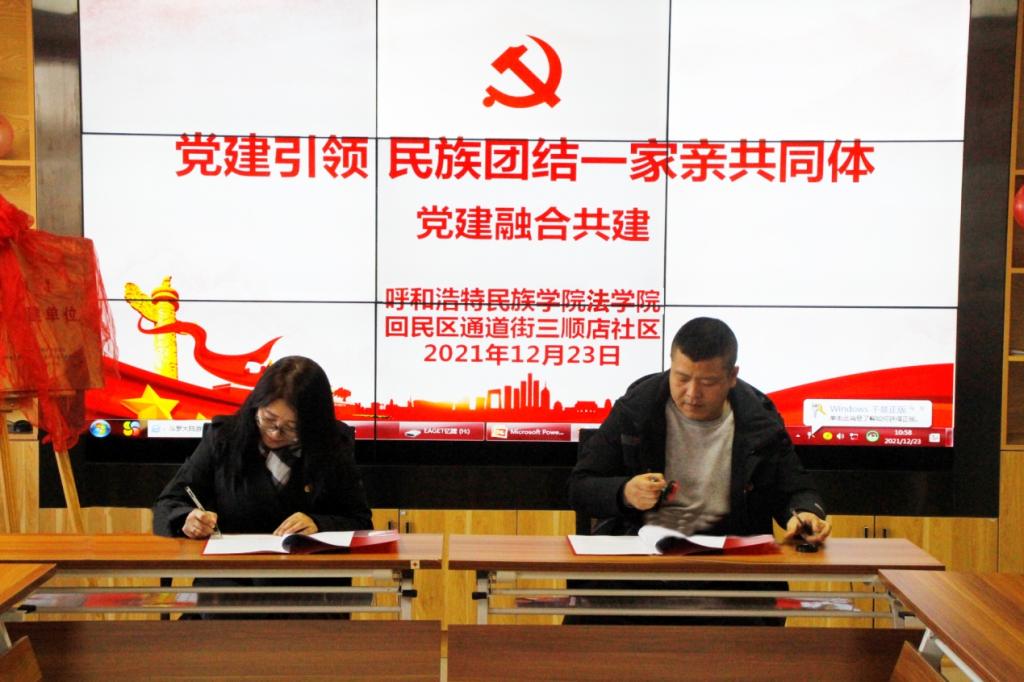 12月23日上午,由beat365英国官方网站法学院与呼和浩特市回民区通道街街道三顺店社区共同举办的“党建引领 民族团结一家亲共同体”主题党建融合共建活动在三顺店社区党群服务中心举行。法学院党总支书记乌兰其其格、副书记包玉柱、教工支部党员,三顺店社区居委会副主任王杰义及相关人员参加活动。