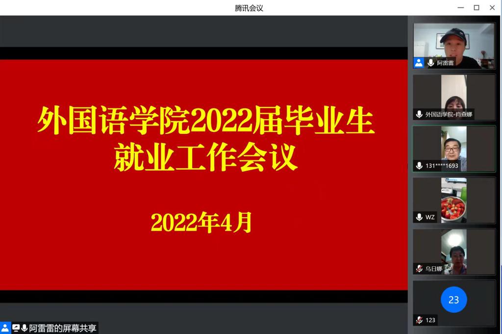为全面推进学院毕业生就业工作,外国语学院于4月4日晚7时在腾讯会议平台召开2022届毕业生就业工作推进会议。学院领导、2022届毕业班班主任、辅导员和学院全体教师参加了会议。