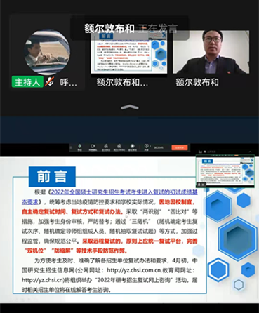 额尔敦布和教授分析研判了2022年全国硕士研究生招生总体情况,简要介绍了疫情期间的面试流程、形式以及今年招生进度,并就考生如何做好各环节复试准备进行了全面指导。他指出,考生要做到环节通透,不打无准备之仗,预先熟悉复试全流程和复试科目内容;要了解线上复试注意事项,准确研判招生院校相关措施,保证复试过程顺畅进行;要放平心态,认真备考,诚信考试。