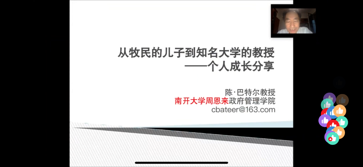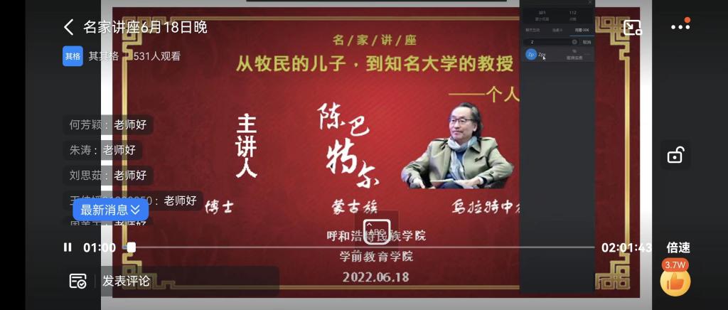 6月18日晚,我院特邀南开大学民族研究中心主任、南开大学周恩来政府管理学院博士生导师陈巴特尔教授,以视频会议的形式,开展了以“从牧民的儿子,到知名的大学教授—个人成长分享”为题的专题讲座。讲座由我院其其格副院长主持,我院全体师生参加。
