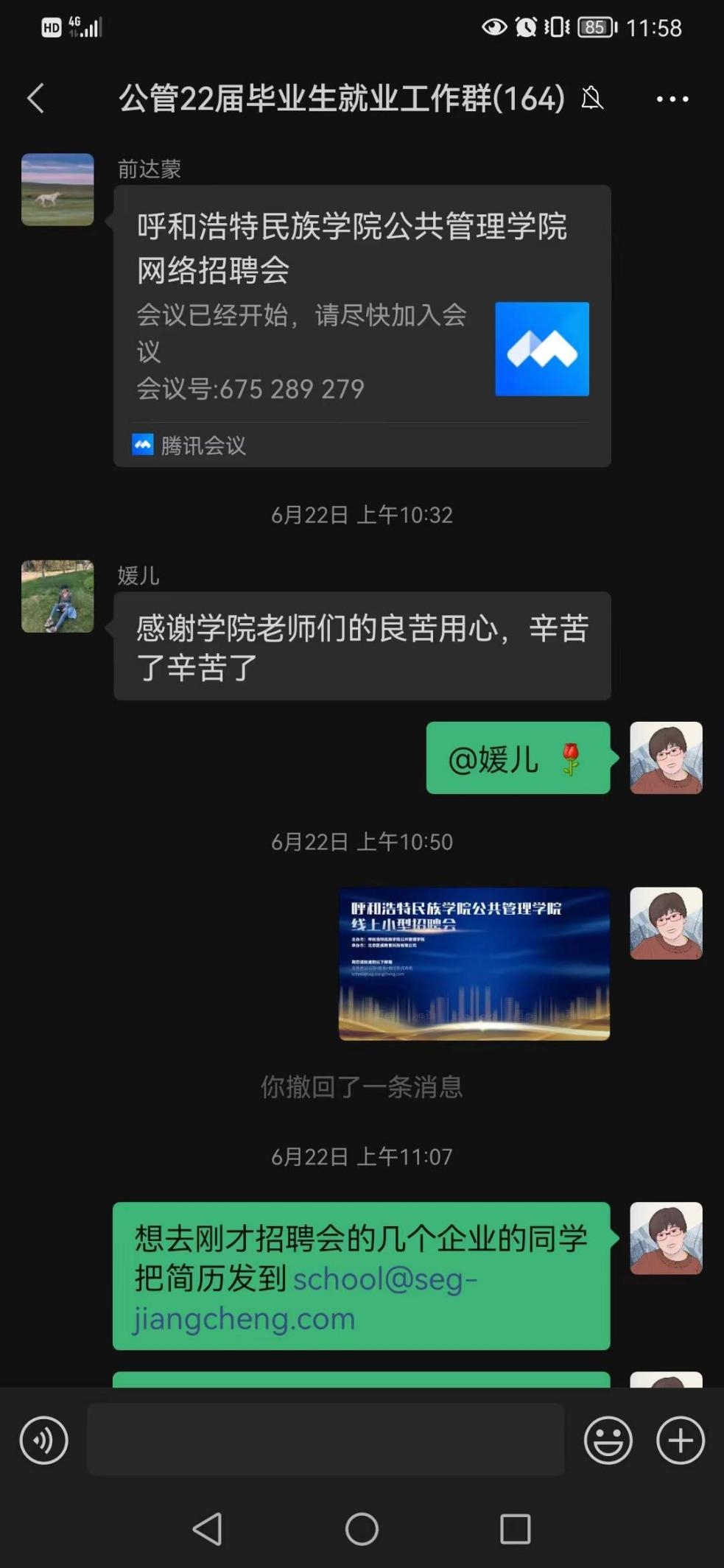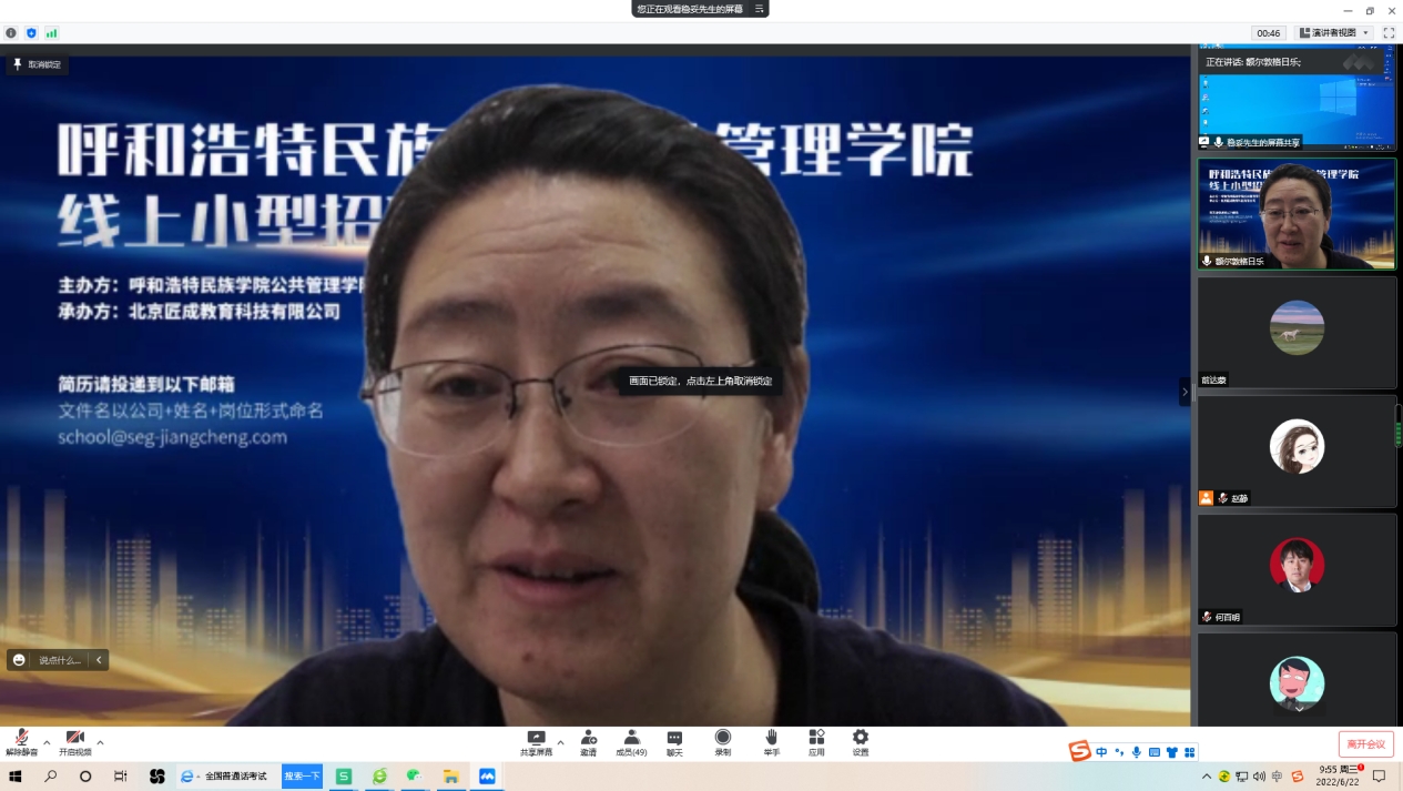 学校党委推进就业工作的相关要求,促进校企深度融合发展,全力做好我院毕业生更加充分、更高质量就业,满足我院广大毕业生求职需求,公共管理学院携手北京匠成教育科技有限公司于2022年6月22日举办了2022届毕业生企业宣讲招聘会。会议由党总支副书记额尔敦格日勒主持。