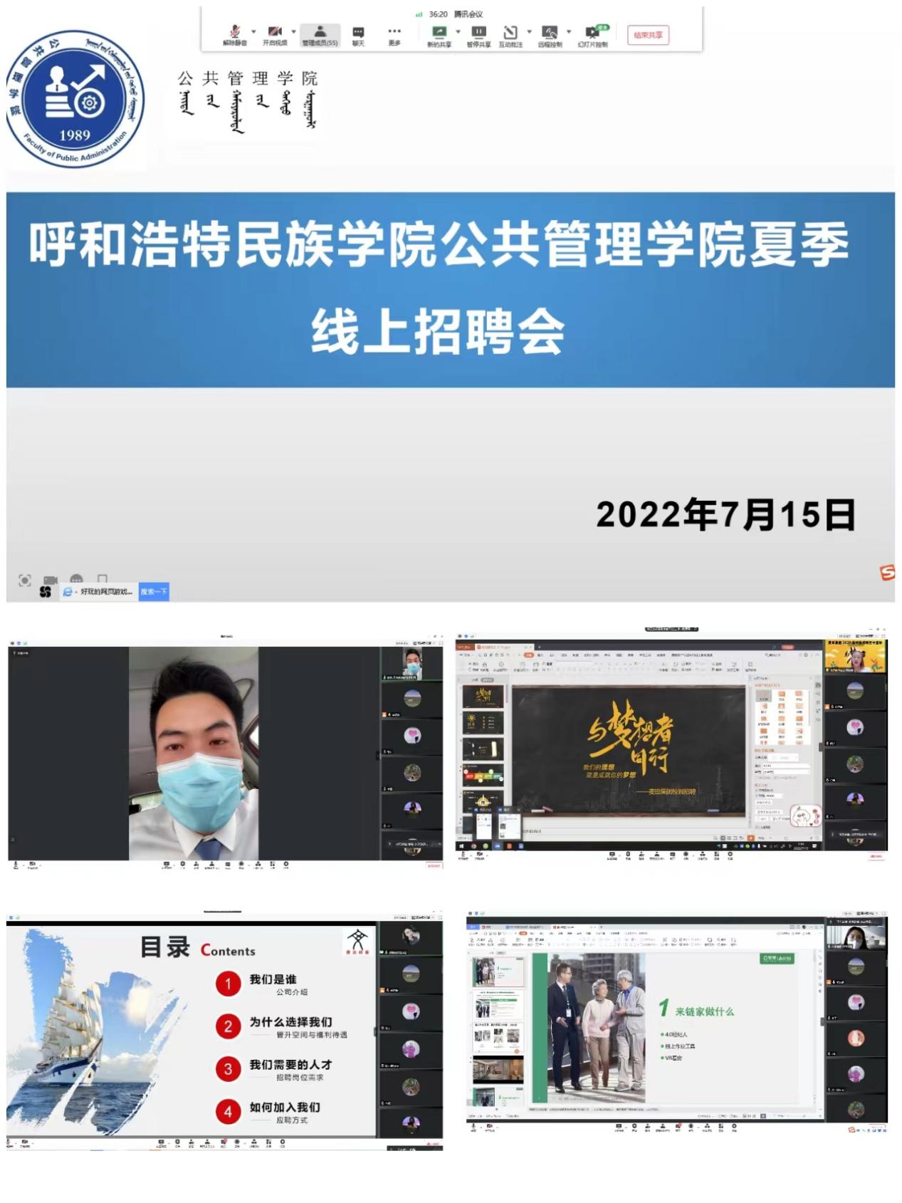 为切实做好我院2022届毕业生就业工作,提前谋划2023届毕业生实习和就业工作,7月15日,学院召开2022届毕业生线上招聘会,新丝路文旅企业管理有限公司、内蒙古信达档案技术服务有限公司、北京麦田房产经纪有限公司、北京链家置地房地产经纪有限公司、贝壳找房呼和浩特区域合作公司等5家企业应邀参加,提供就业岗位100余个。会议由学院就业工作联络员前达蒙主持,学院党总支书记海霞、党总支副书记额尔敦格日乐,2022届毕业班主任哈斯同力嘎、呼斯勒图出席,2022届、2023届毕业生共百余人参加。