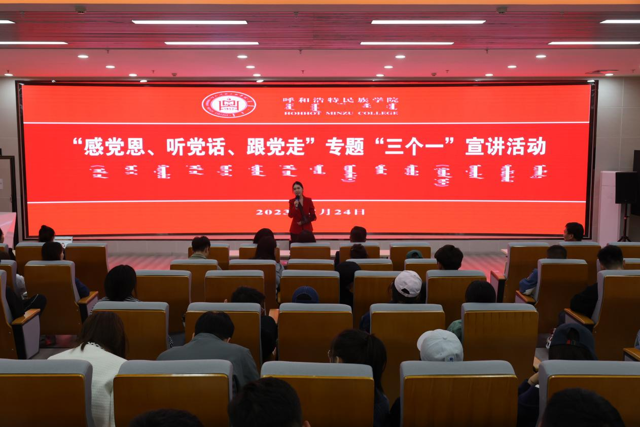 宣讲会上,思政课教师代表张海峰、学生代表张翎艳、多丽雅等三位主题教育宣讲团成员,运用大量的图片素材和短视频,通过叙述改革开放以来,尤其是进入新时代以来内蒙古大地发生的翻天覆地的变化和内蒙古各族人民蒸蒸日上的美好生活中所展现出的感人小故事和身边鲜活的案例,充分展现了在党的民族政策的光辉照耀下,内蒙古各族儿女共同团结奋斗,共同繁荣发展的美好景象。