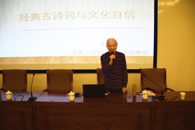 讲座中,李淑章教授从“文化自信”和“经典古诗词”两个方面,深入浅出地分析了“文化自信”的意义和内涵。他指出,中国优秀的传统文化是国家发展的基础,中国的社会主义文化是面向世界、面向未来、面向现代化的,是民族、科学、大众的文化。在新时代统筹推进“五位一体”总体布局中,我们要把文化建设放在重要地位,因为优秀的传统文化是流淌在我们民族血液里的发展基因和力量,是“四个自信”的取之不尽用之不竭的源泉。李淑章教授特别阐述了“经典古诗词”对“文化自信”的意义和影响,并以王维《九月九日忆山东兄弟》为例,就中国古诗中的“对写法”,即“主客移位法”,进行了深入讲解。李淑章教授注重引导进行文化思考,使与会师生受益匪浅。精彩的演讲,不时引起阵阵热烈的掌声。