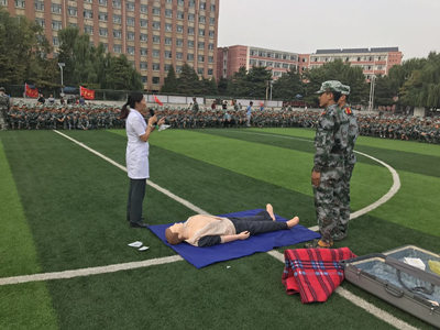 刘晋雯医生首先讲授了心肺复苏术的理论知识,并对急救的整个流程及注意事项进行了演示与详细讲解。随后,现场组织新生进行分组演练。在此次培训活动中,由承训部队教官配合实践操作培训演示,并让各连同学通过复苏模拟人进行了实际操作。
