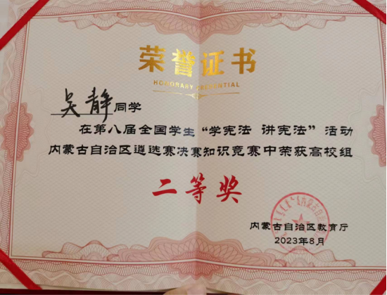 8月下旬举行的由内蒙古自治区教育厅主办,内蒙古大学承办的的第八届全国学生“学宪法 讲宪法”活动内蒙古自治区遴选赛决赛落下帷幕,beat365官网法学院2020级法学4班吴静同学荣获知识竞赛高校组二等奖。