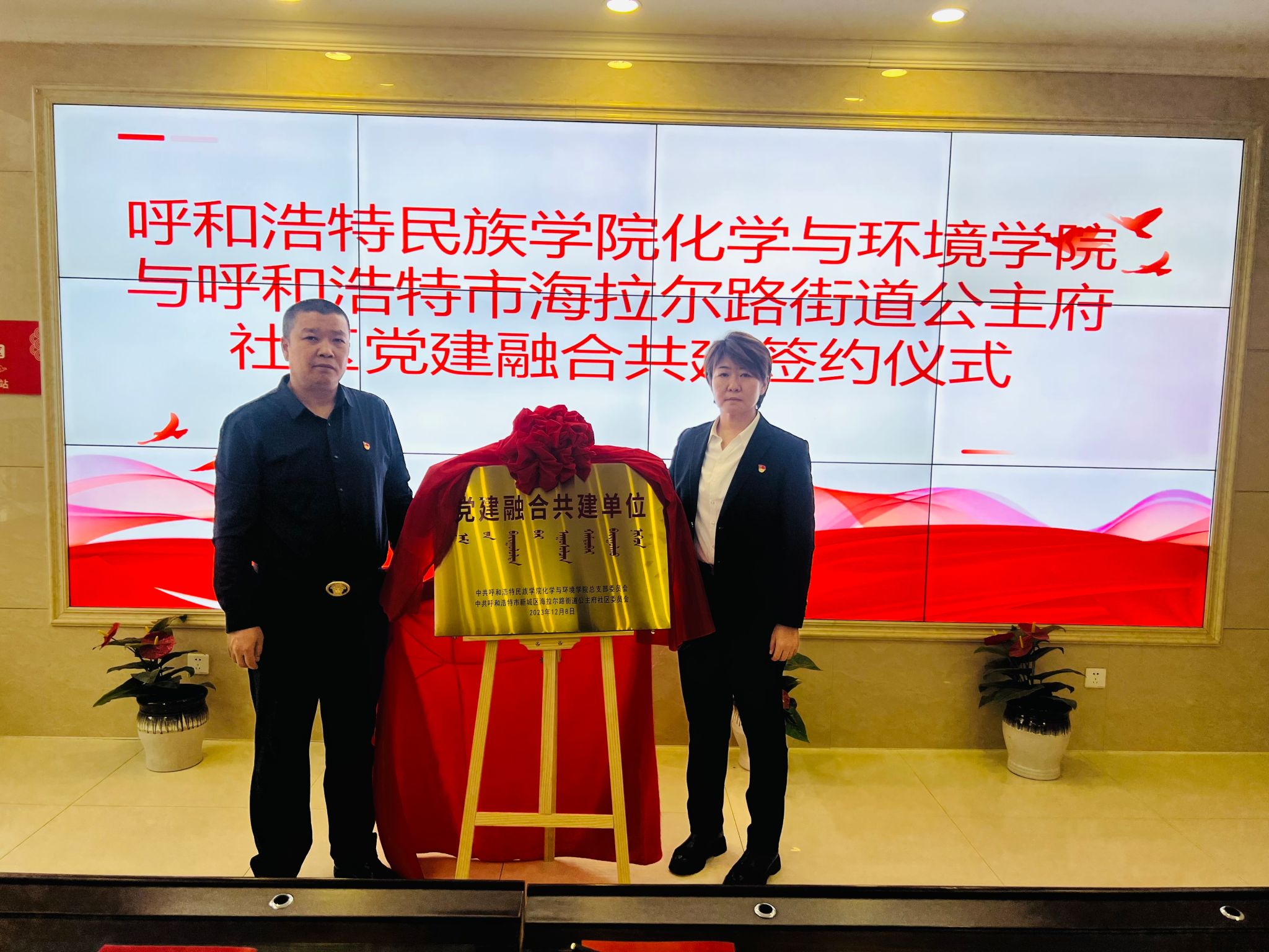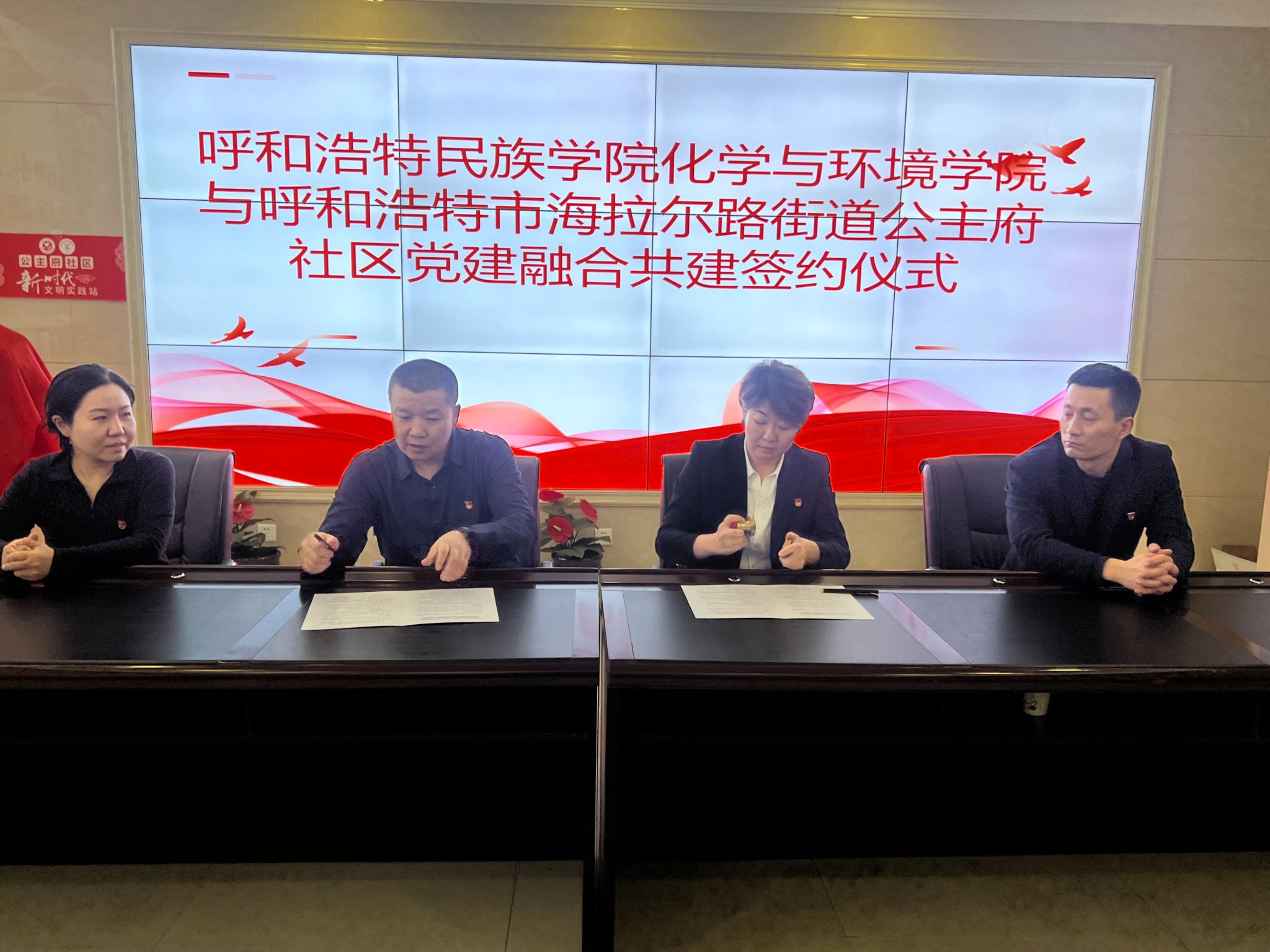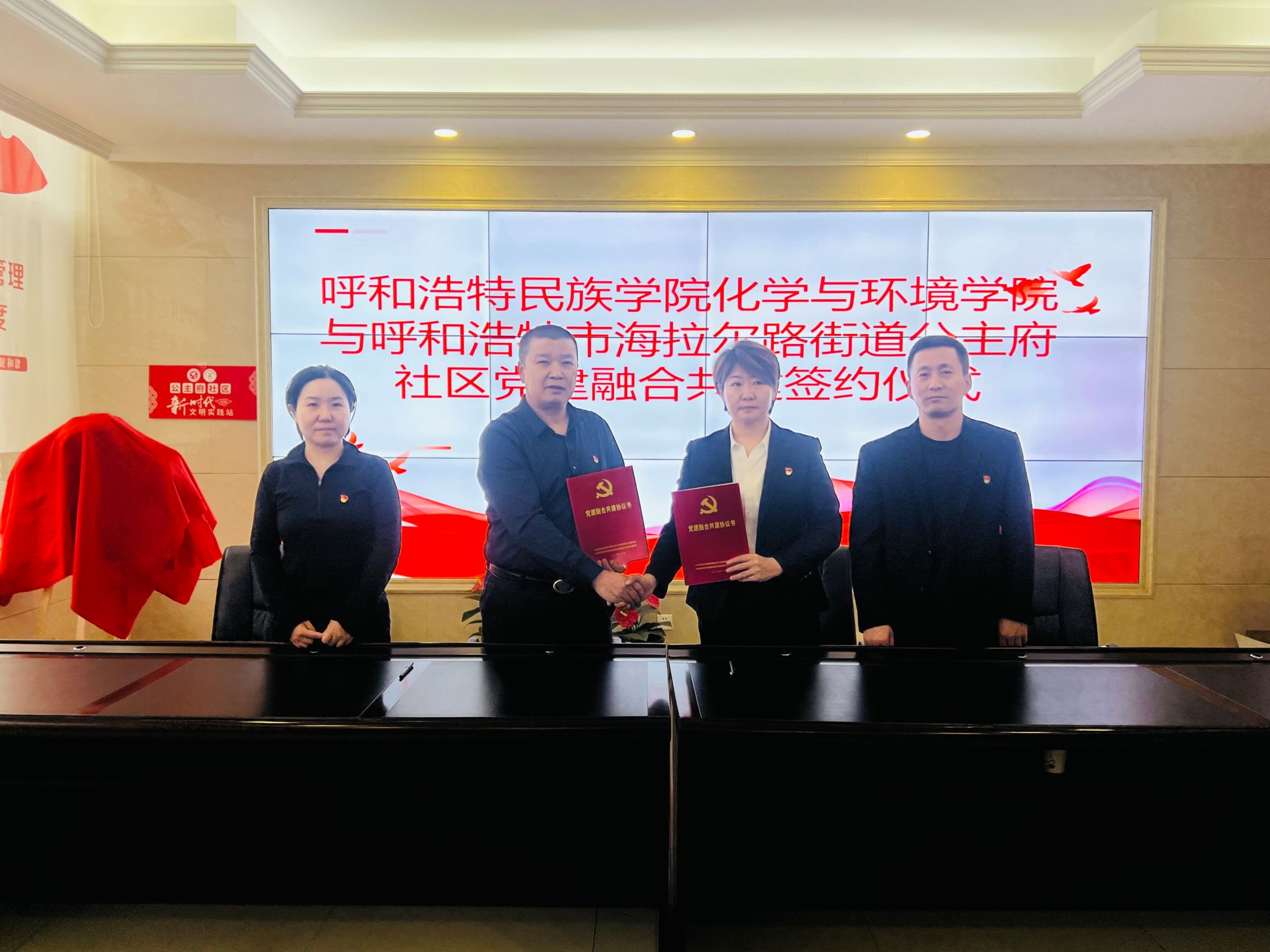 为进一步强化党建引领作用,推动“高校+社区”党建工作双向联动,充分整合高校与社区的党建资源及各自优势,12月13日,化学与环境学院和呼和浩特市海拉尔路街道公主府社区联合开展了党建融合共建签约仪式。化学与环境学院党总支书记鄂亚彬、副书记乌玉娜,公主府社区党委书记章瑞、党委纪检委员郭树飞出席签约仪式。