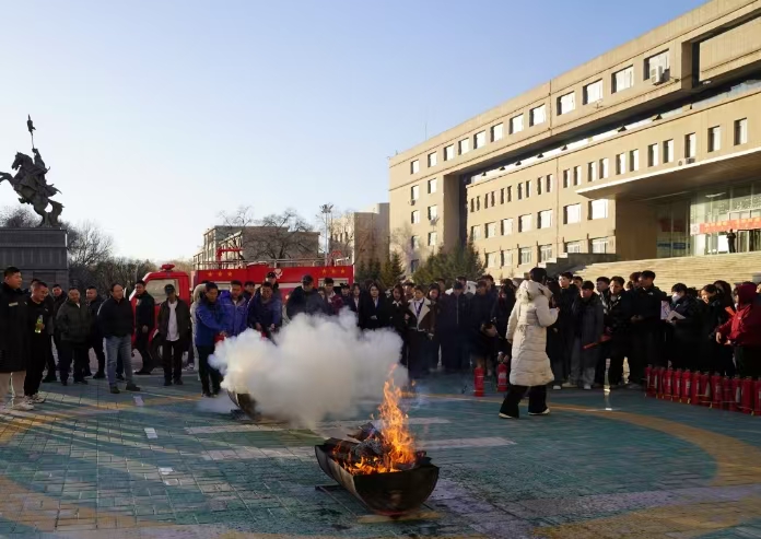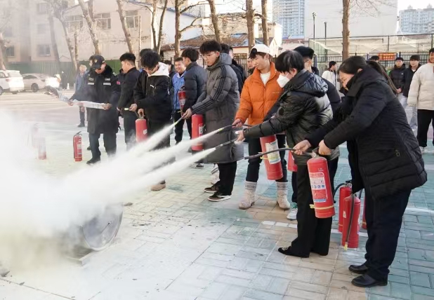 在都林楼前广场进行灭火应急演练,现场模拟初级火灾现场,周志远示范灭火器正确操作步骤,教职工们积极参与灭火过程,通过演练更深刻地掌握了灭火器的正确使用方法。