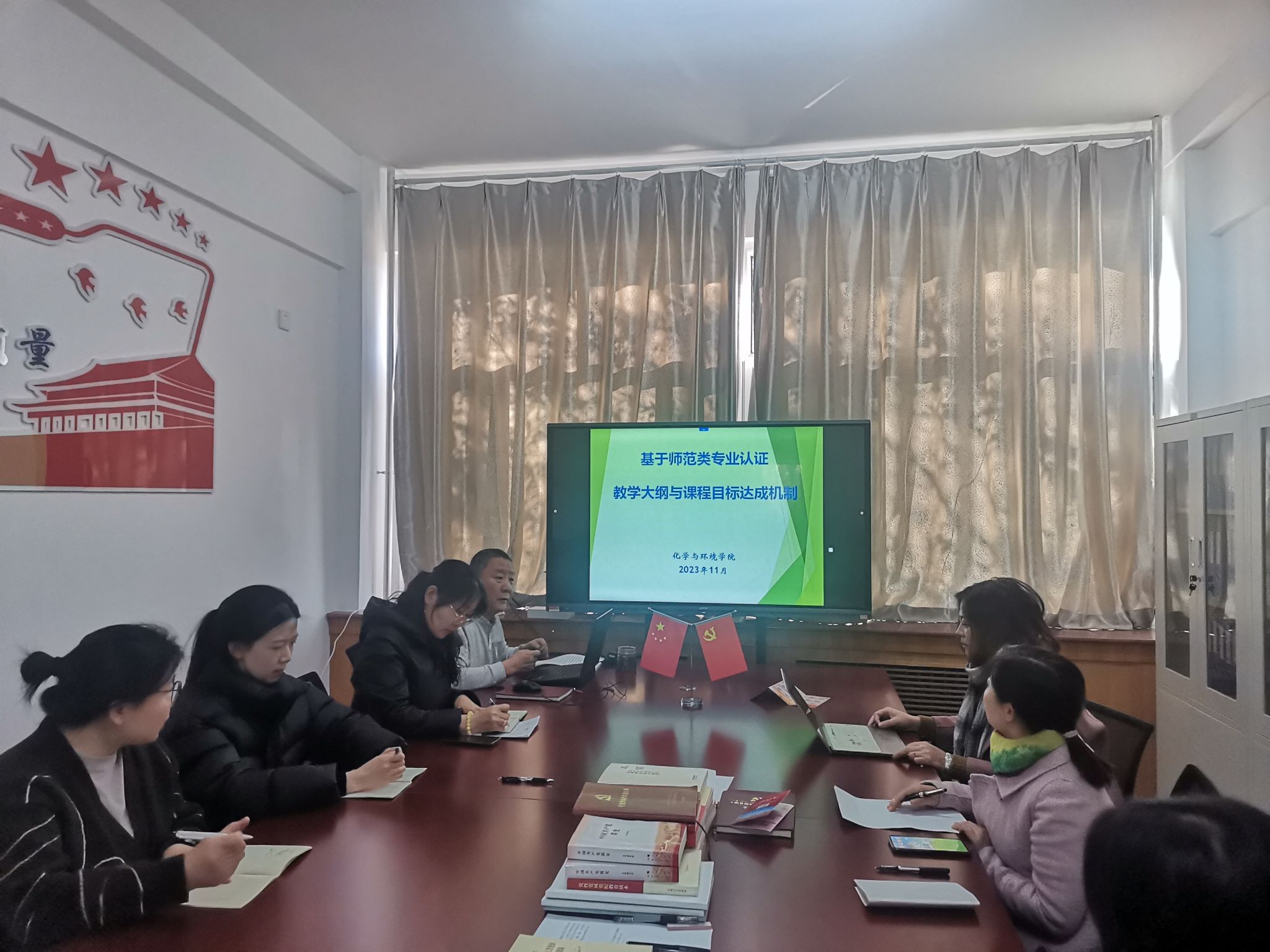 推进专业课程建设,11月9日,化学环境学院邀请学校教师发展与教学评估中心胡毕斯哈拉图主任做了“基于师范类专业认证教学大纲与课程目标达成机制”辅导培训活动。化学与环境学院各专业负责人、教研室主任、一流课程负责人及任课教师参加本次培训,培训会议由学院副院长乌仁陶格斯主持。