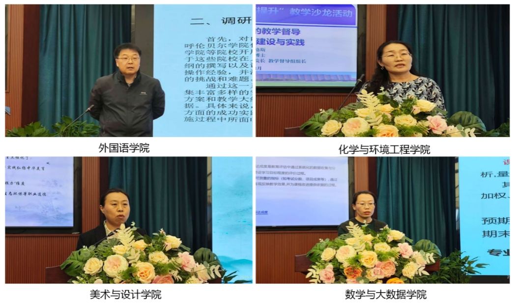 活动中,外国语学院院长秦红喜以“聚焦人才培养:教学大纲与课程达成撰写实战分享”为题,介绍了外国语学院在教学大纲、课程评价标准编制过程中总结出的经验及课程达成分析报告撰写的实操要点。化学与环境工程学院副院长乌仁陶格斯以“基于OBE理念的教学督导与质量保障体系建设与实践交流”为题,阐述如何通过成果导向教育理念构建督导机制,实现教学质量闭环管理。美术与设计学院副院长塔娜以“四维铸魂·五方共育—美术与设计学院实践教学思政育人共同体的探索与实践”为题,展示了学院通过校企协同、文化浸润等多路径构建实践教学思政育人共同体的创新成果。数学与大数据学院教师敖民以“课程目标达成度计算工作分享”为题,用数据驱动视角演示了课程评价的科学化流程与工具应用。
