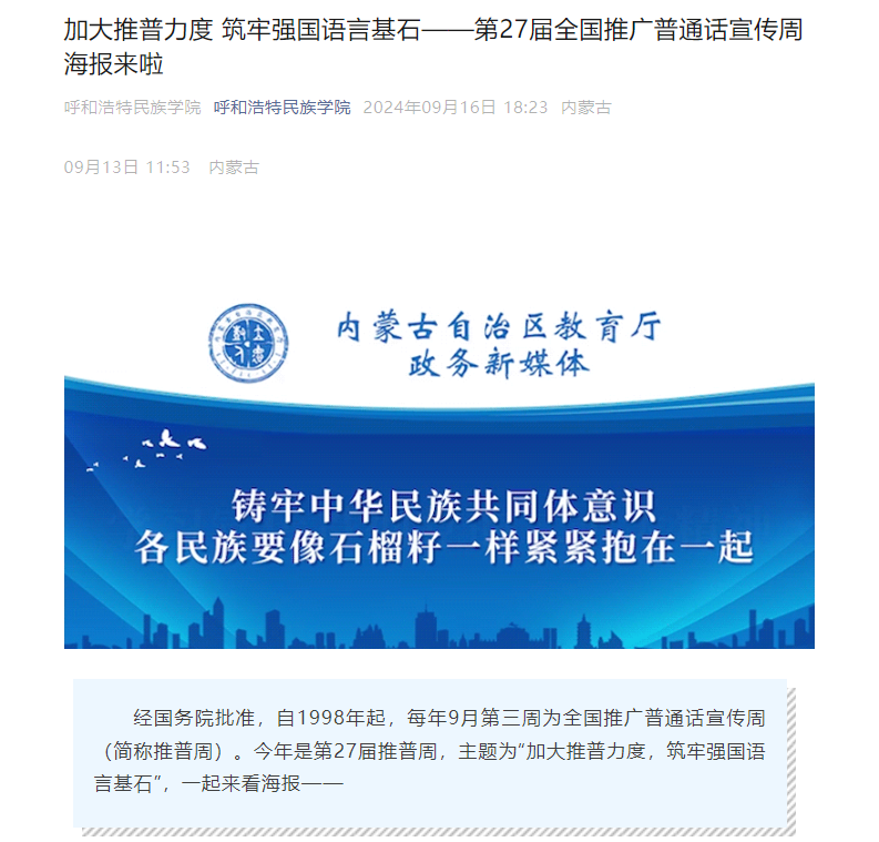 学校官方公众号分别发布《加大推普力度,筑牢强国语言基石 | 第27届全国推广普通话宣传周内蒙古自治区公益宣传片来啦》《加大推普力度 筑牢强国语言基石——第27届全国推广普通话宣传周海报来啦》《加大推普力度,筑牢强国语言基石 | 第27届全国推广普通话宣传周》《第27届全国推广普通话宣传周重点活动在新疆喀什举办》等推文在师生中进行广泛宣传。教学楼、宿舍楼等11块思政教育电子屏上投放第27届推普周宣传海报进行滚动宣传播放。各学院也结合专业特色印制海报、悬挂条幅,共同营造了浓厚的推普学习活动氛围。