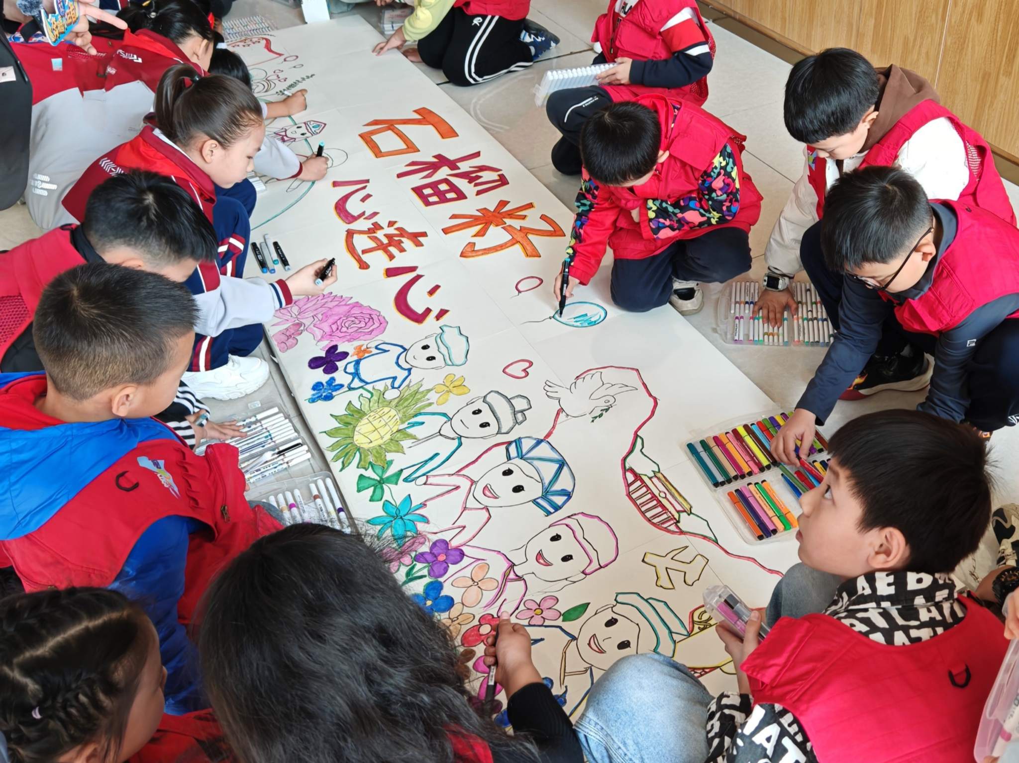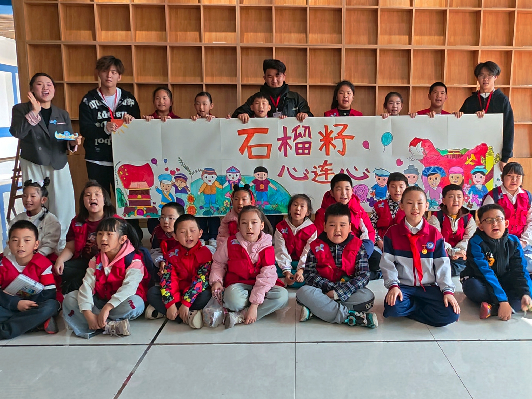 在活动中,“北疆小红马”大学生讲解员陈宣锦,以大手拉小手的方式,带领于思涵、王赟泽、王宸菲、鲁旭瑶、肖清云、郝思语等6位北垣小学(公主府校区)的红领巾讲解员一道开展讲解。讲解员们以中华文明的起源为起点,结合馆内丰富的图文、实物以及多媒体互动等教育资源,引导小记者们探索“我们从哪里来?”“我们是谁?”“我们要到哪里去?”等问题,深入理解中华民族共同体的含义。参观结束后,美术与设计学院的大学生与小记者团成员共同创作了以“石榴籽 心连心”为主题的画卷。本次活动通过“听、看、绘”相结合的方式,使青少年在行走的课堂中埋下爱我中华的种子,树立正确的国家观、历史观、民族观、文化观、宗教观,巩固民族团结的思想根基。