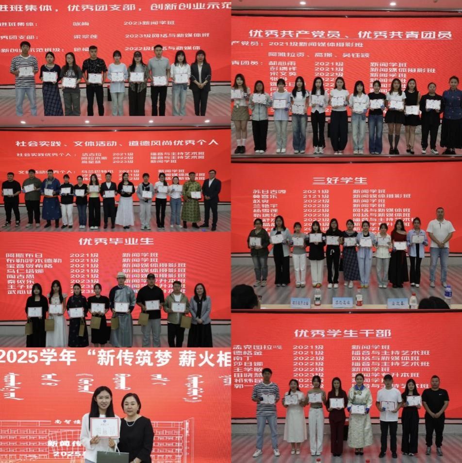 5月26日,新闻传媒学院“新传筑梦 薪火相传”主题表彰大会在北院图书馆一楼报告厅举行。新闻传媒学院党总支书记苏伦高娃、院长额尔敦毕力格、党总支副书记王丽、副院长安迎春,以及专业教师、班主任、辅导员、获奖学生代表共150余人参加。
