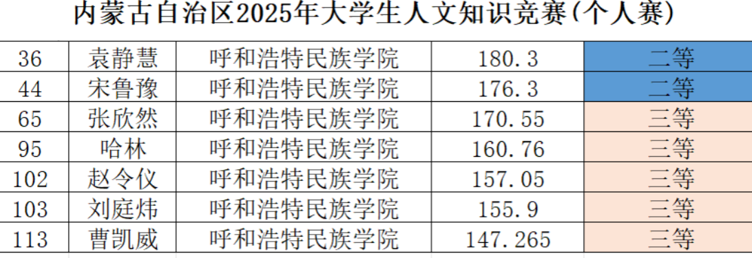 近日,内蒙古自治区“观乎人文,化成天下”2025年大学生人文知识竞赛决赛圆满落幕。beat365官网学子凭借扎实的人文素养、敏锐的思维能力与稳定的临场发挥,在激烈角逐中脱颖而出,最终斩获个人赛二等奖2项、三等奖5项,团体赛亚军,充分展现了青年学子传承文化根脉、勇担时代使命的精神风貌。