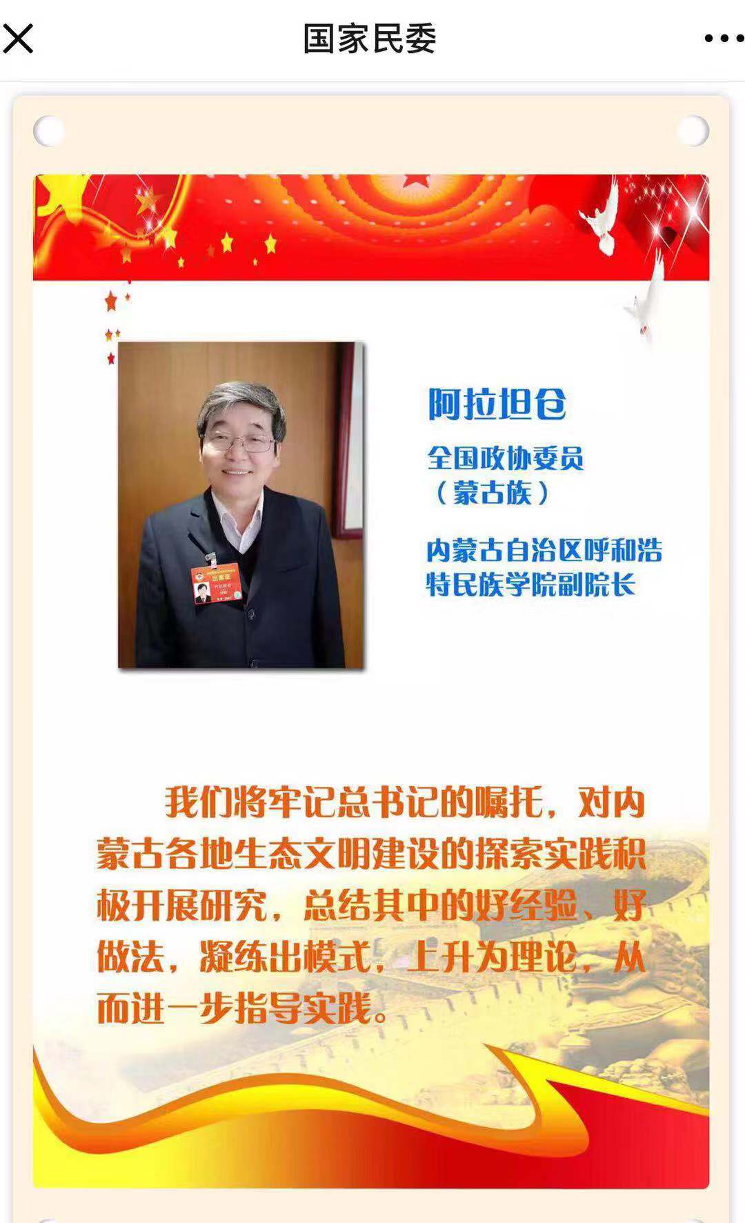 会议期间,阿拉坦仓副院长以饱满的政治热情和高度的政治责任感,认真履职,聚焦社会民生、民族教育等热点问题,为两会递交了“精准扶贫的理论层面研究”、“民族团结的文化根基”、“民族教育的发展方式”等内容的提案,并在小组讨论中建言资政,发挥好政协委员联系群众的桥梁纽带作用,高质量地完成好大会赋予的各项使命任务。