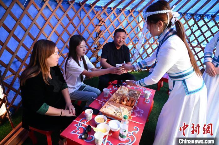 8月30日,内蒙古呼和浩特市,身着民族服装的学生用蒙古族传统美食招待新同学一家。中新社记者 刘文华 摄