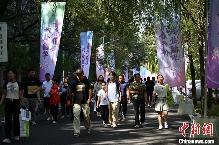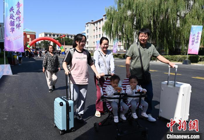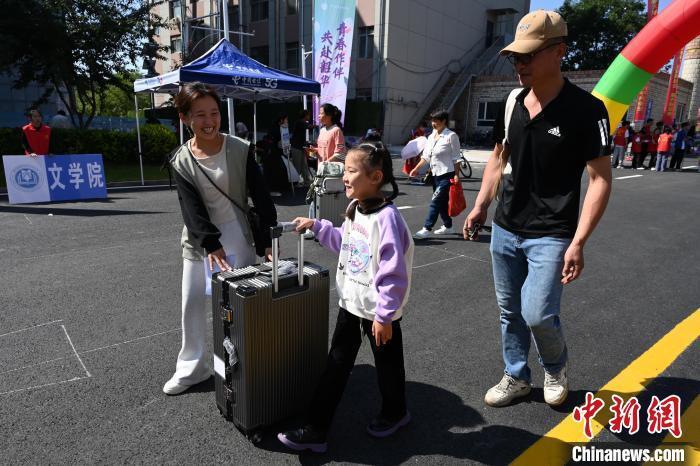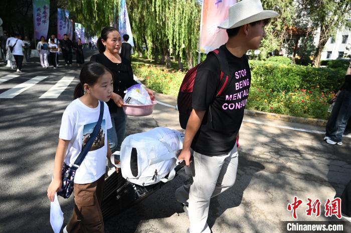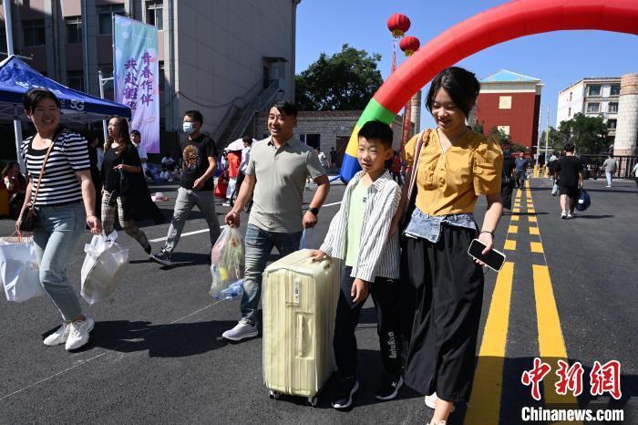8月30日,内蒙古呼和浩特市,全家陪同大学生入校报到。中新社记者 刘文华 摄