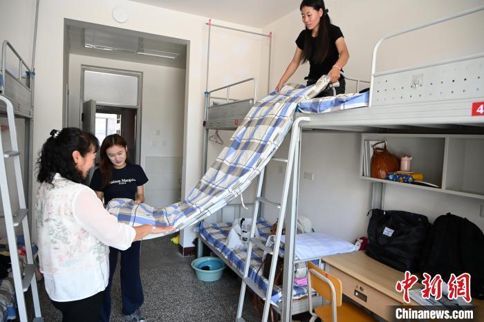 8月30日,内蒙古呼和浩特市,大学生与家长一起收拾被褥。中新社记者 刘文华 摄