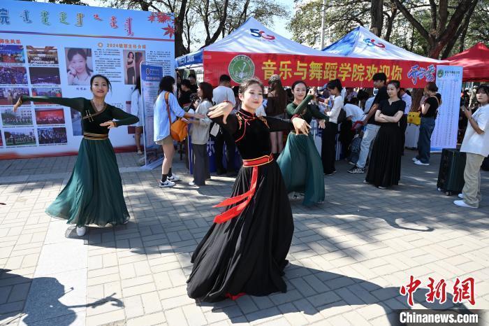 8月30日,内蒙古呼和浩特市,学姐们表演蒙古族舞蹈欢迎新同学。中新社记者 刘文华 摄