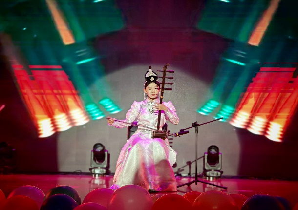 晚会节目众多, 其中歌曲令人回味无穷,黄文静同学带来的是四胡独奏《牧马青年》、李泽雅同学帅气演唱《Shake My Head》、家长布和巴图演唱的《chamaig sanhad》和《bainu》,退伍军人李文海等人合唱的《蓝莲花》以及美丽同学所演唱的《萨日奈》。他们用嘹亮的歌声唱出了青春的活力与激情,一首首动听的歌曲回荡在礼堂上空,让观众们沉浸在音乐的海洋中,享受着音乐带来的美好。