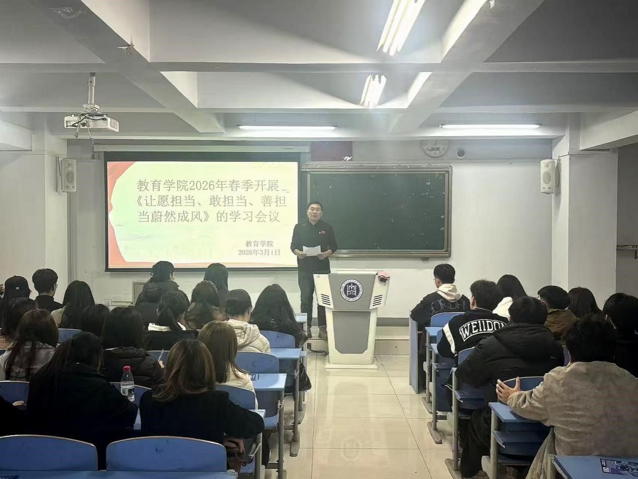 3月1日,教育学院团总支组织全院学生干部和学生代表,开展了以“让愿担当、敢担当、善担当蔚然成风”为主题的专题学习会议,上好新学期“开学第一课”。