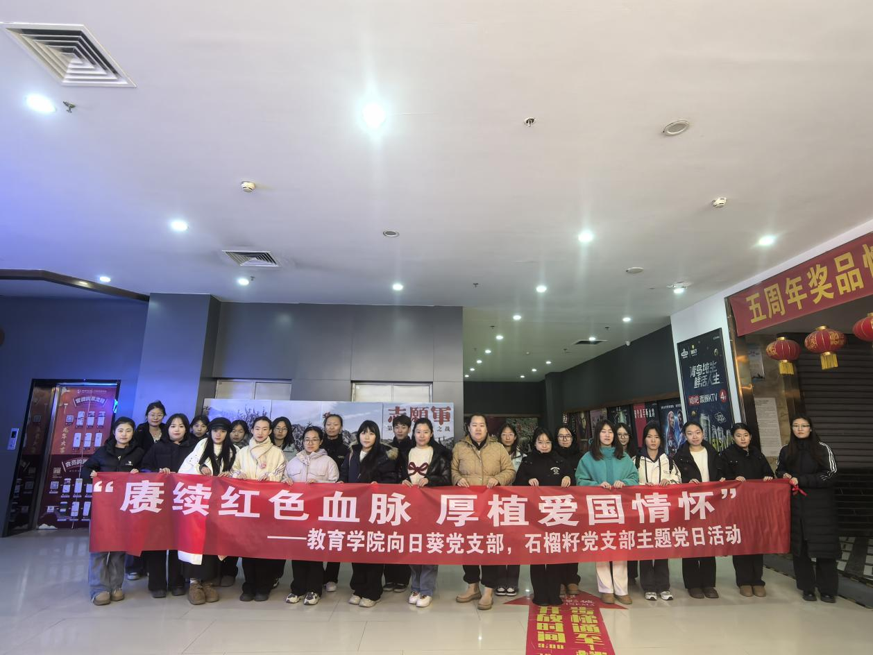 为深入贯彻习近平总书记关于传承红色基因,赓续红色血脉的重要指示精神,教育学院石榴籽党支部联合向日葵党支部于2024年12月13日和14日下午开展“赓续红色血脉,厚植爱国情怀”为主题的党日活动,通过观看红色主题电影《志愿军》,让学生党员深切感受志愿军战士英勇无畏、舍生忘死的英雄气概,将红色精神转化为砥砺前行、担当作为的实践行动。