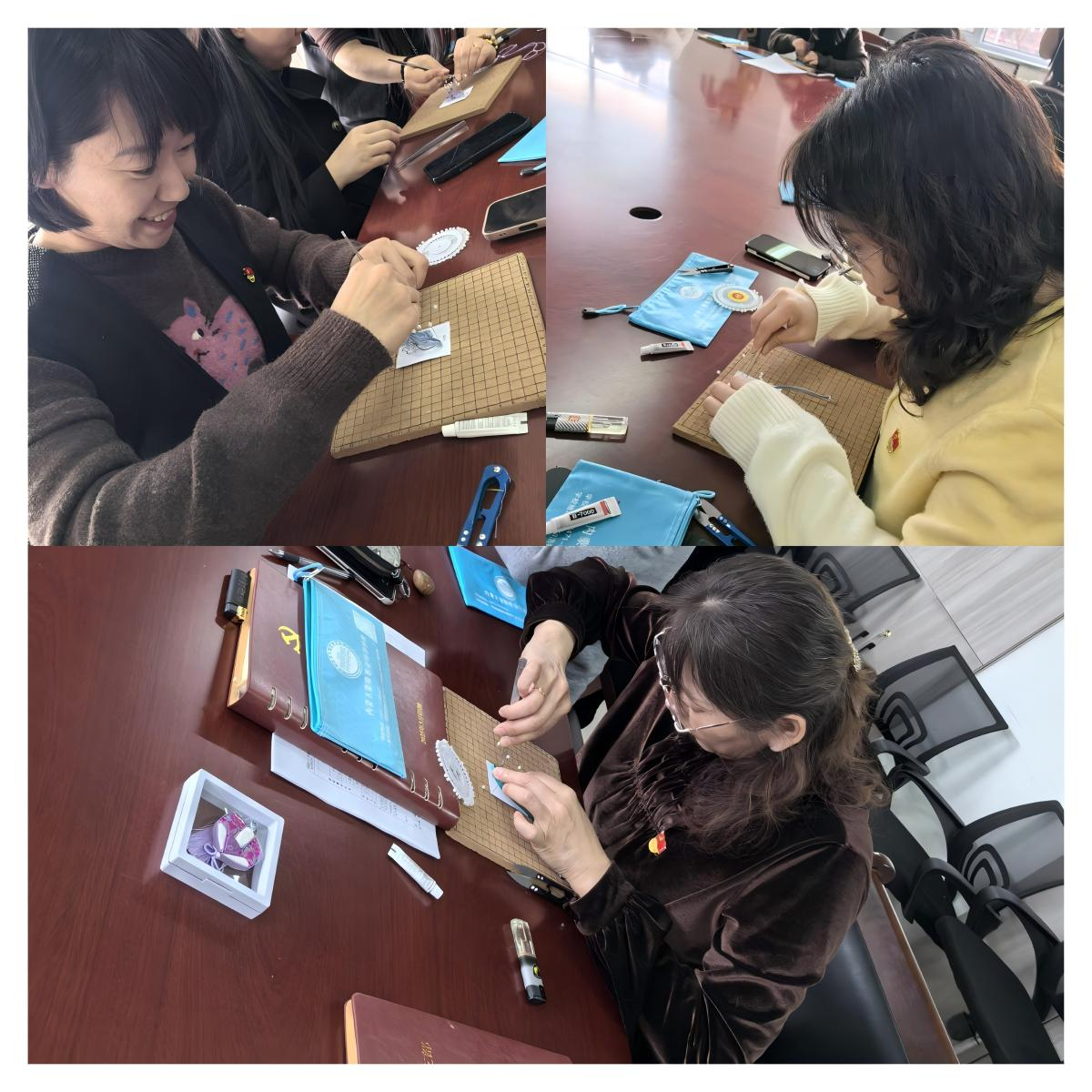 活动特别邀请非遗手工专业老师现场授课指导,老师围绕非遗胸针制作工艺展开细致讲解,同步手把手示范点胶、镶嵌等关键操作步骤,耐心为女职工们答疑解惑,细致指导每一个制作环节。实践环节中,全院女职工热情高涨、专注投入,纷纷化身 “能工巧匠”,在穿针引线、拼贴镶嵌间用心雕琢,大家一边动手创作专属胸针,一边相互交流心得、分享制作技巧,现场气氛温馨热烈、融洽和谐随着时间推移,一枚枚设计独特、做工精巧的非遗胸针陆续成形,大家手捧自己的作品,脸上洋溢着满满的成就感与幸福感。