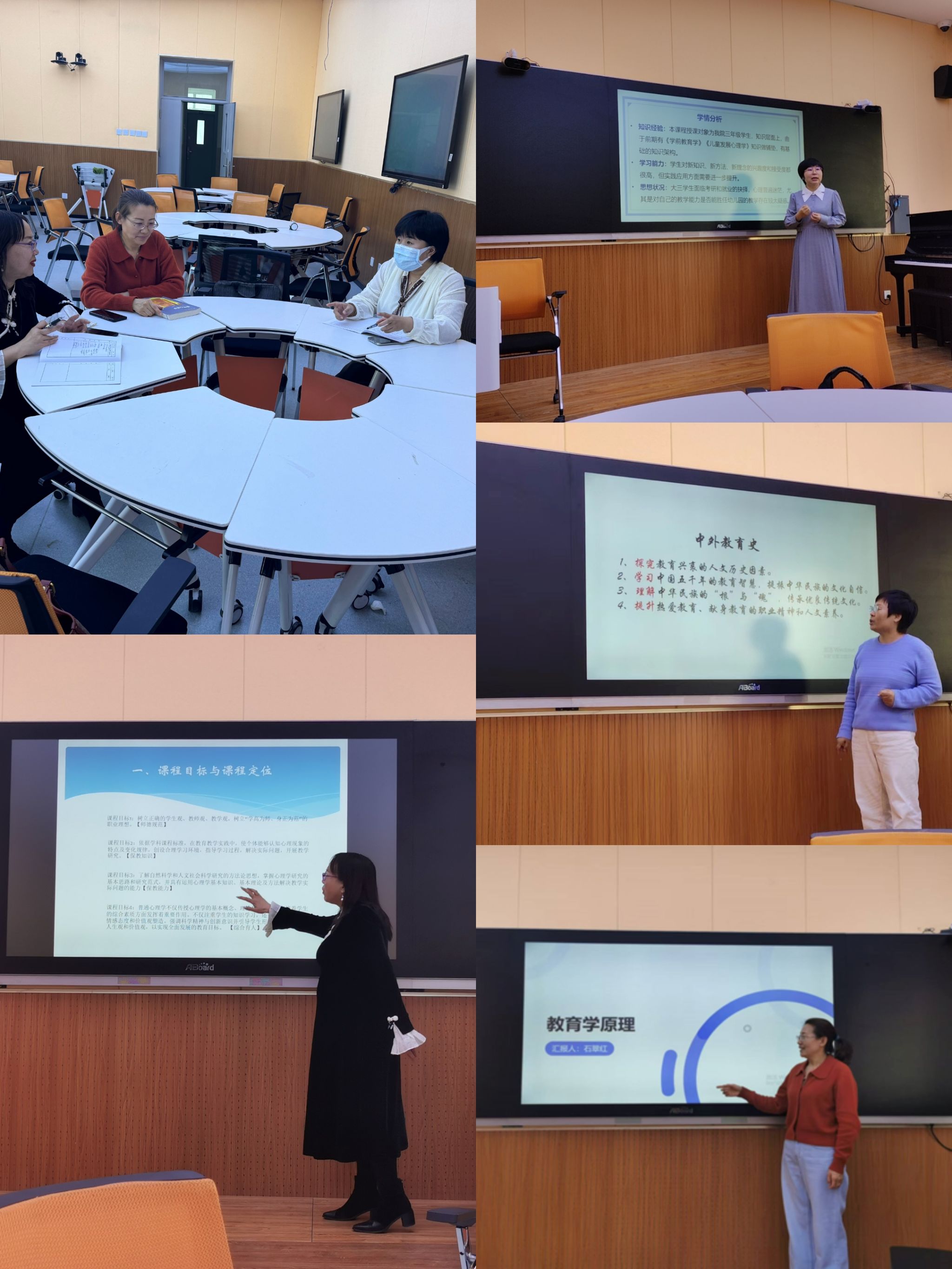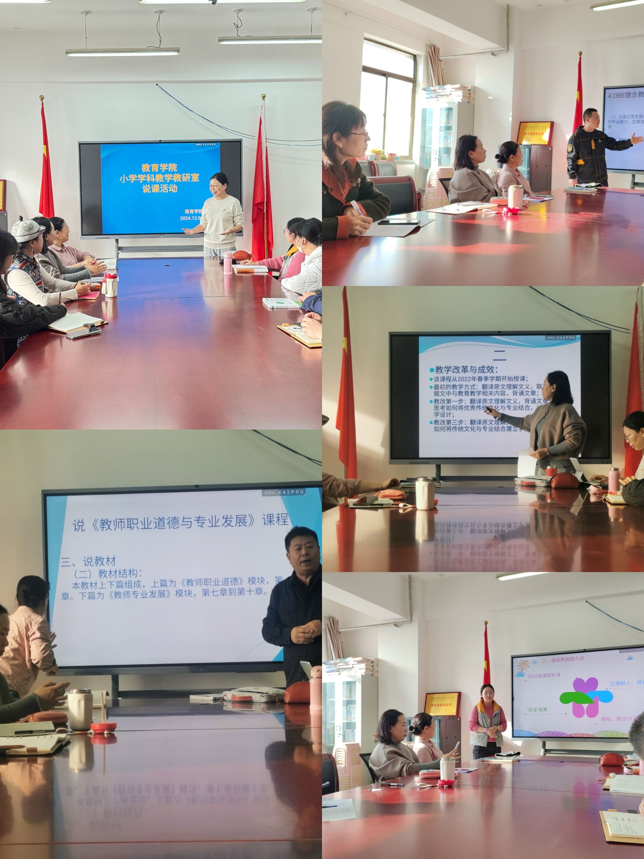 为提升教师教学水平,促进教育教学改革,迎接新一轮审核评估和师范专业认证工作,按照学校统一安排,12月6日,教育学院组织下属各教研室开展说课程活动,各教研室主任精心准备动员组织,教育学院全体授课教师参与,院领导班子到各教研室说课活动现场观摩点评。