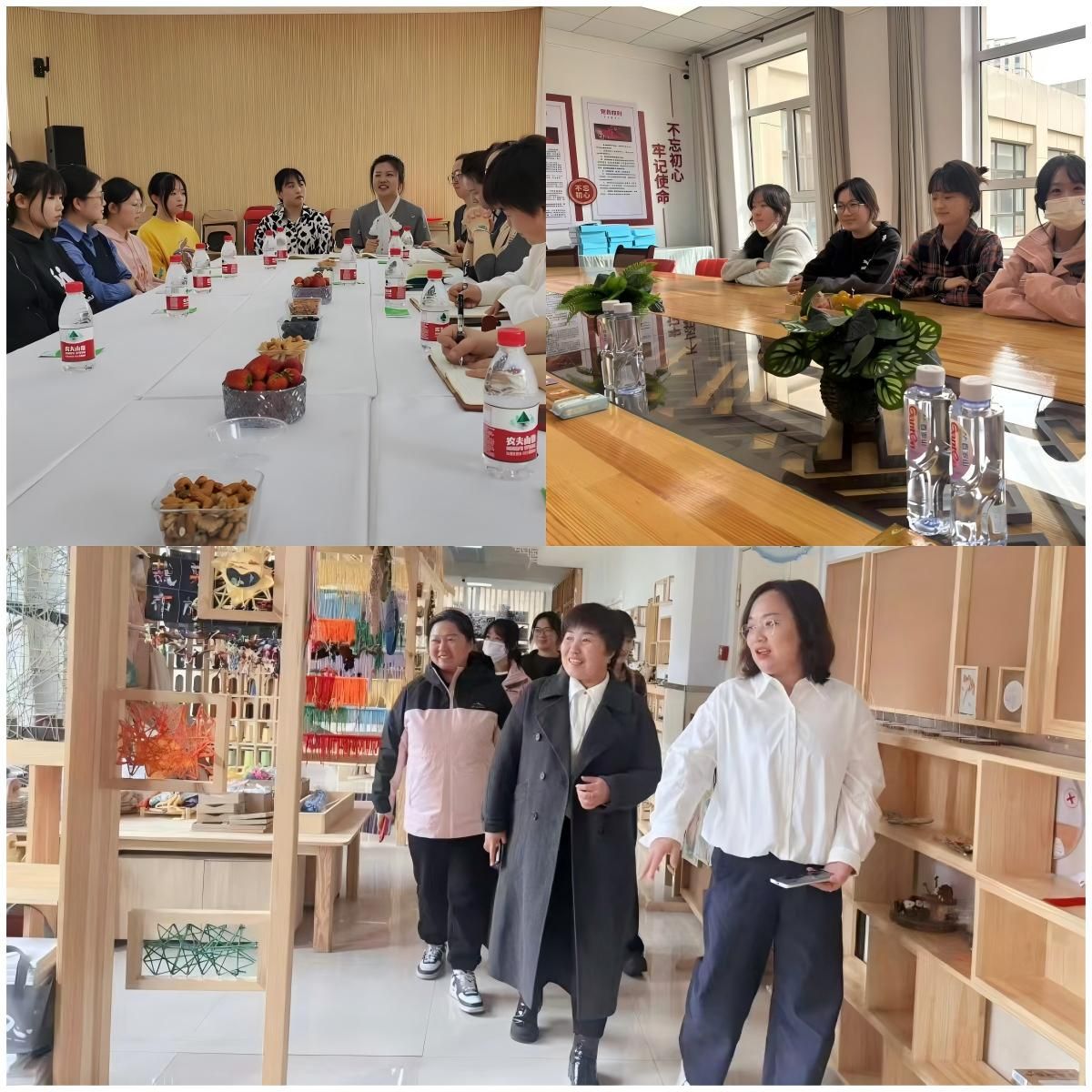 之后,回访团队分别在九原区哈业胡同中心幼儿园、九原区第四幼儿园、九原区世纪路第一幼儿园园长们的陪同下,参观了三所幼儿园的教学设施、活动场地、幼儿生活区域等,对幼儿园的硬件条件和教学环境有了直观了解。在实习生座谈会上,正在园内实习的学前教育专业学生们踊跃发言,分享了实习期间的收获与成长。学生们分别表示:“通过参与幼儿园的日常教学和管理工作,不仅将课堂上学到的理论知识运用到了实践中,还学会了如何与孩子们建立良好的互动关系,提升了自己的沟通能力和应变能力。”、“结合个人成长经历,自己从农村走出去,到城市里求学,再到农村实习时,深切感受到“不忘初心”的神圣使命及价值所在。”同时,学生们也提出了在实习过程中遇到的困惑,如如何更好地组织集体教学活动、怎样应对幼儿的特殊行为问题等。针对这些问题,学院教师和幼儿园指导教师现场进行了交流探讨,给予了专业的指导和建议。