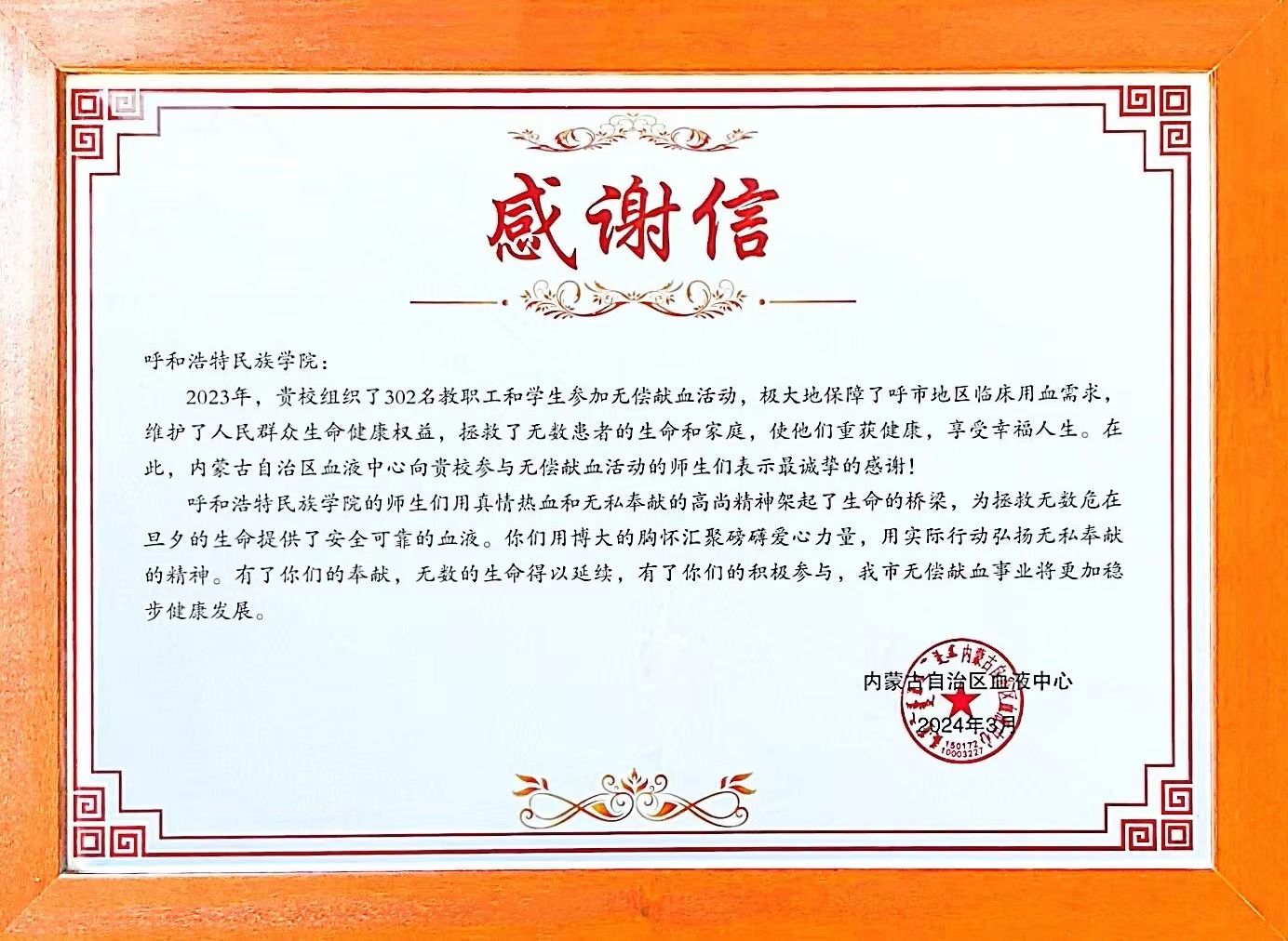 近日,自治区血液中心向我院发来感谢信,向我院广大师生学子对无偿献血事业的大力支持表示感谢。2023年,beat365官网教职工和学生进行了无偿献血,师生们用真情热血和无私奉献精神,架起生命桥梁,为呼和浩特市地区临床用血需求提供有力保障,维护了人民群众的生命健康。