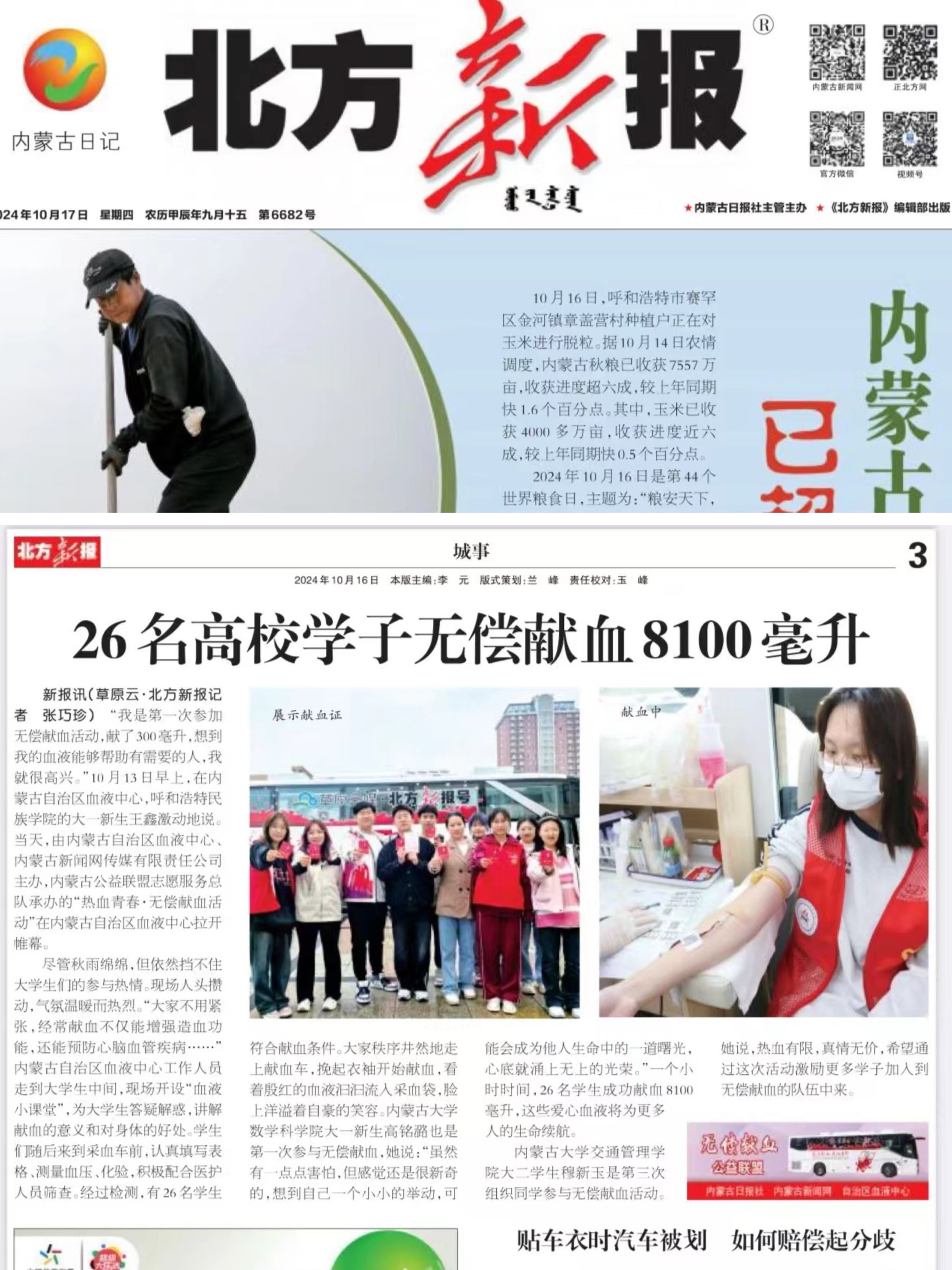 为深入学习贯彻党的二十届三中全会精神,大力弘扬助人为精神,展现新时代大学生的使命担当,充分发挥高校师生无偿献血主力军作用,10月13日上午商学院学生党员走学生进内蒙古自治区血液中心与多个志愿组织联合开展“青春热血,奉献有我”献血主题党日活动。商学院学生党员、入党积极分子等50余名青年志愿者参加当天活动。
