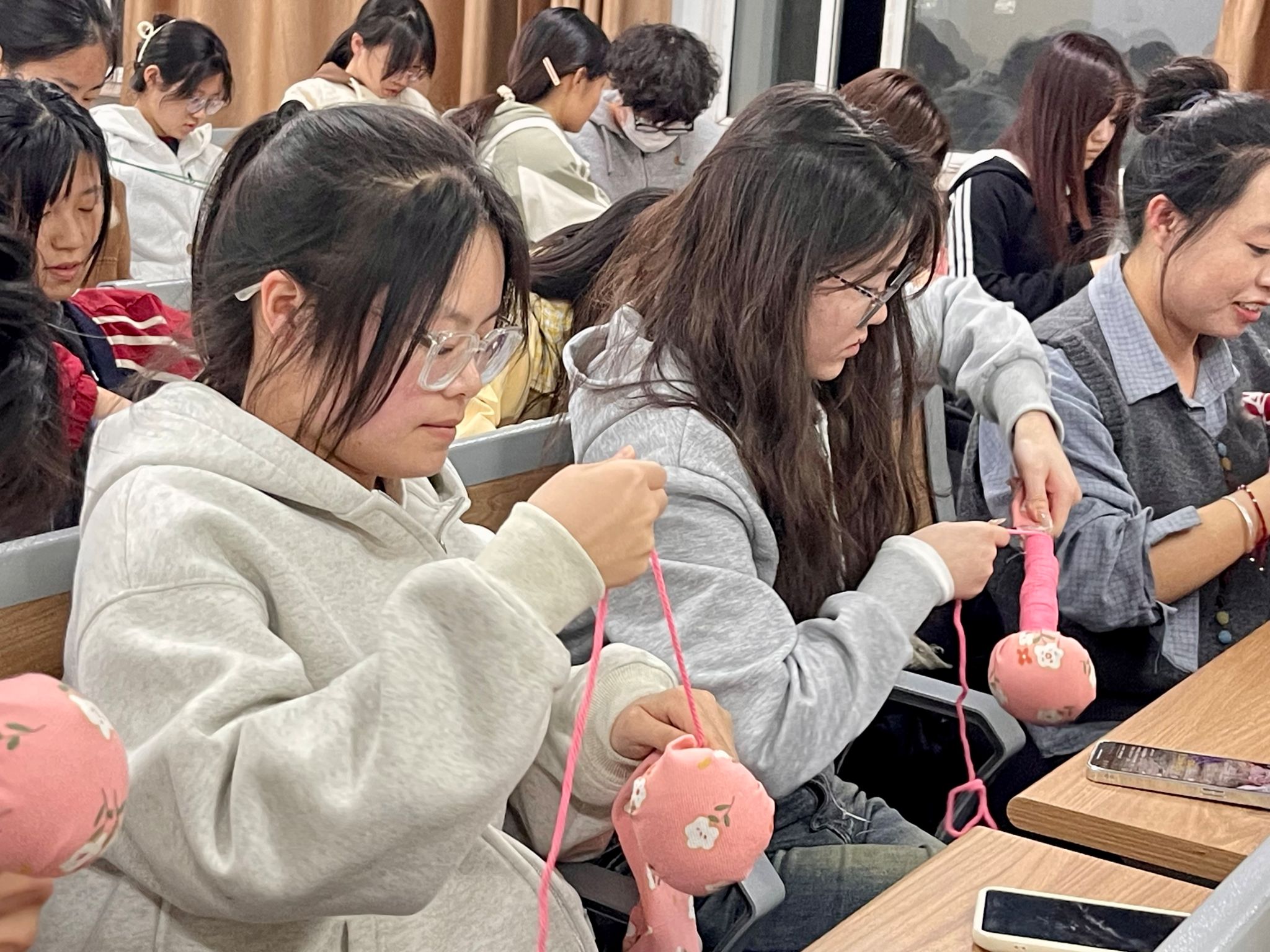 活动以"手作+文化"形式展开,学生代表首先讲解艾草锤的历史渊源与中医养生价值,现场演示选材、捆扎、编织等制作工艺。随后,参与者亲手挑选艾叶、棉花等天然材料,用棉布包裹成锤形,再以彩色棉线缠绕固定,完成兼具实用与装饰性的艾草锤作品。