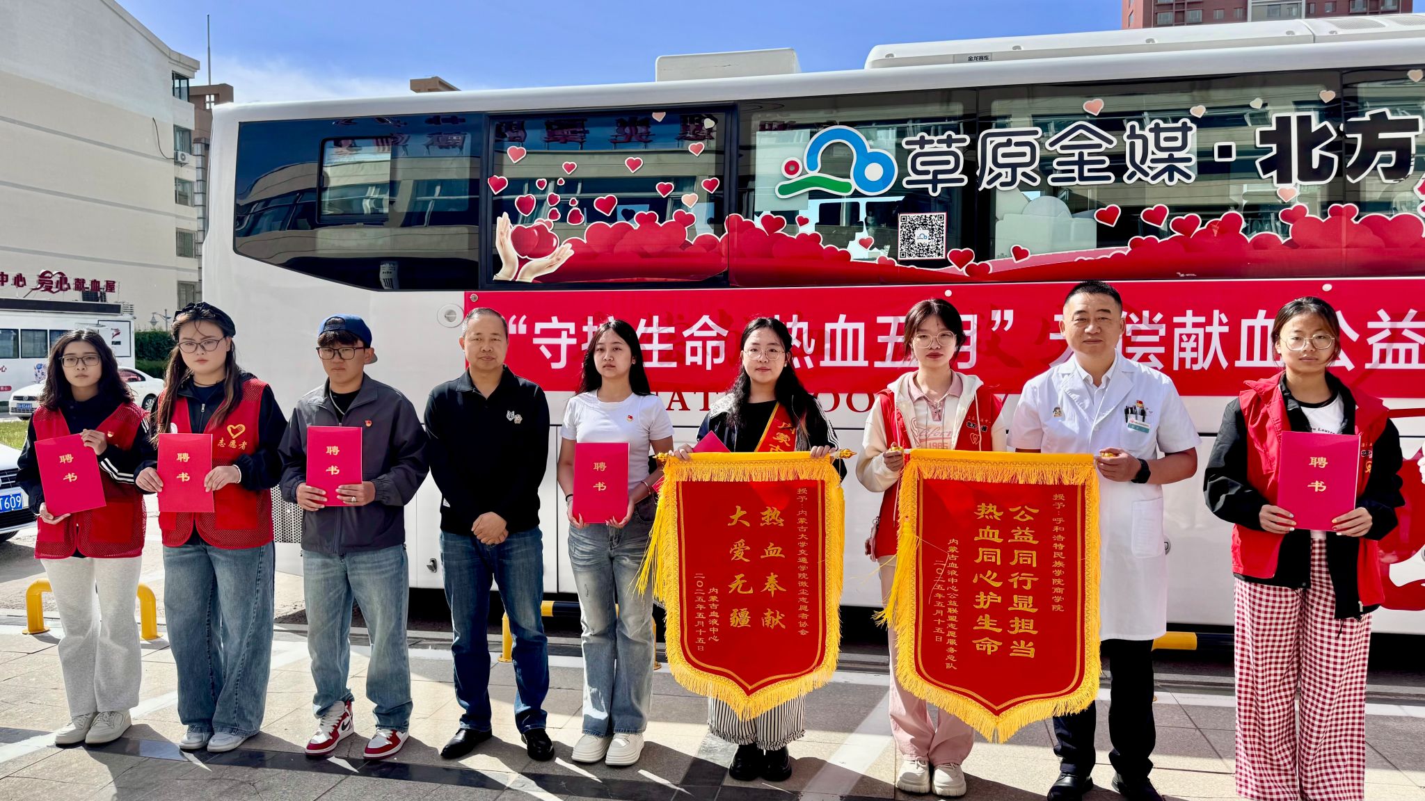 表彰环节坚持"注重实绩、简化程序"要求,内蒙古自治区血液中心主任张硕为 2024 年度 “优秀志愿者” 颁发荣誉证书内蒙古新闻网传媒有限责任公司《北方新报》副总编辑刘霄则向商学院志愿者代表颁发聘书并赠予锦旗,高度肯定其为无偿献血事业发展所付出的努力与做出的积极贡献。整个表彰过程控制在15分钟内,避免铺陈仪式。