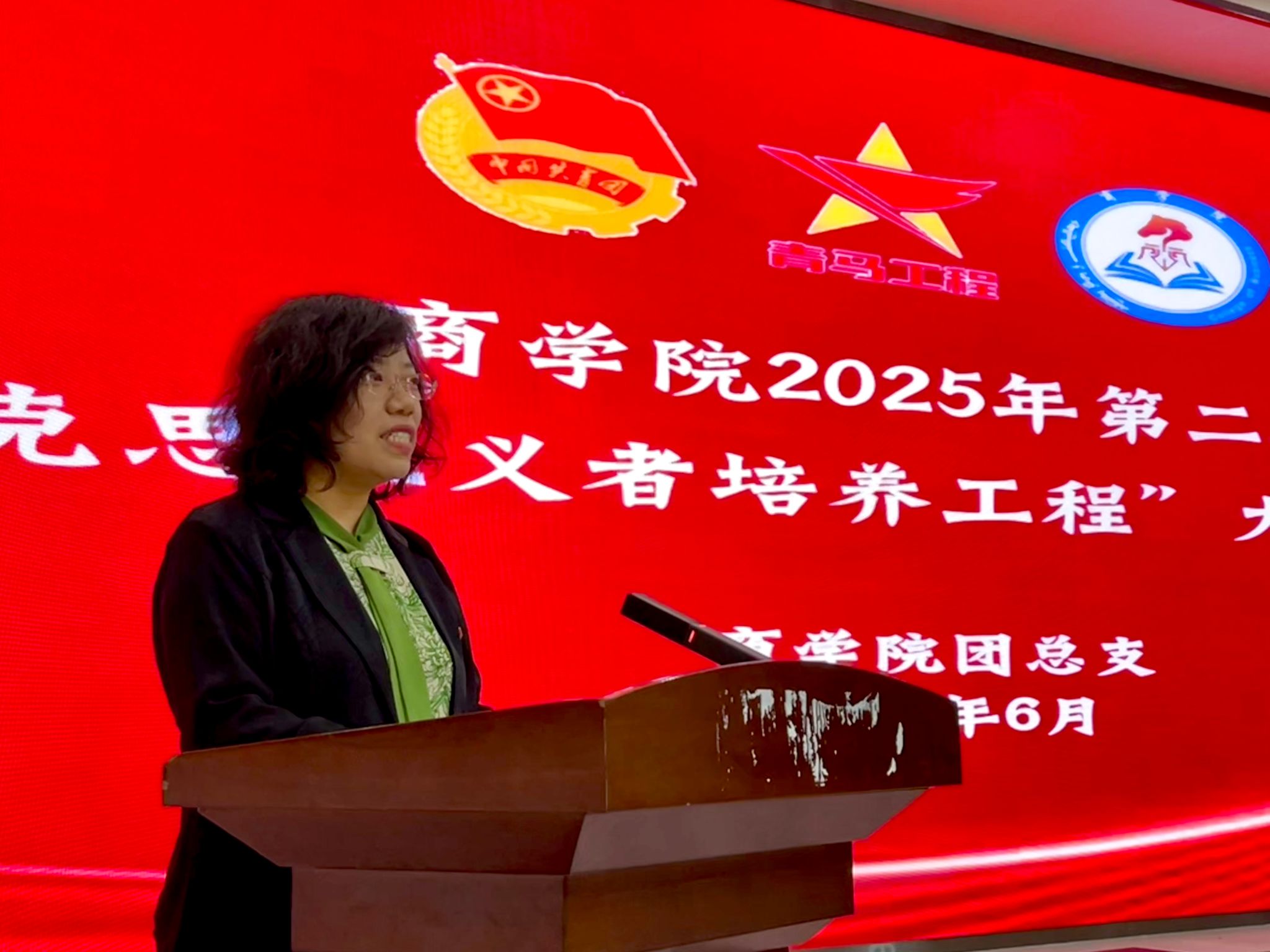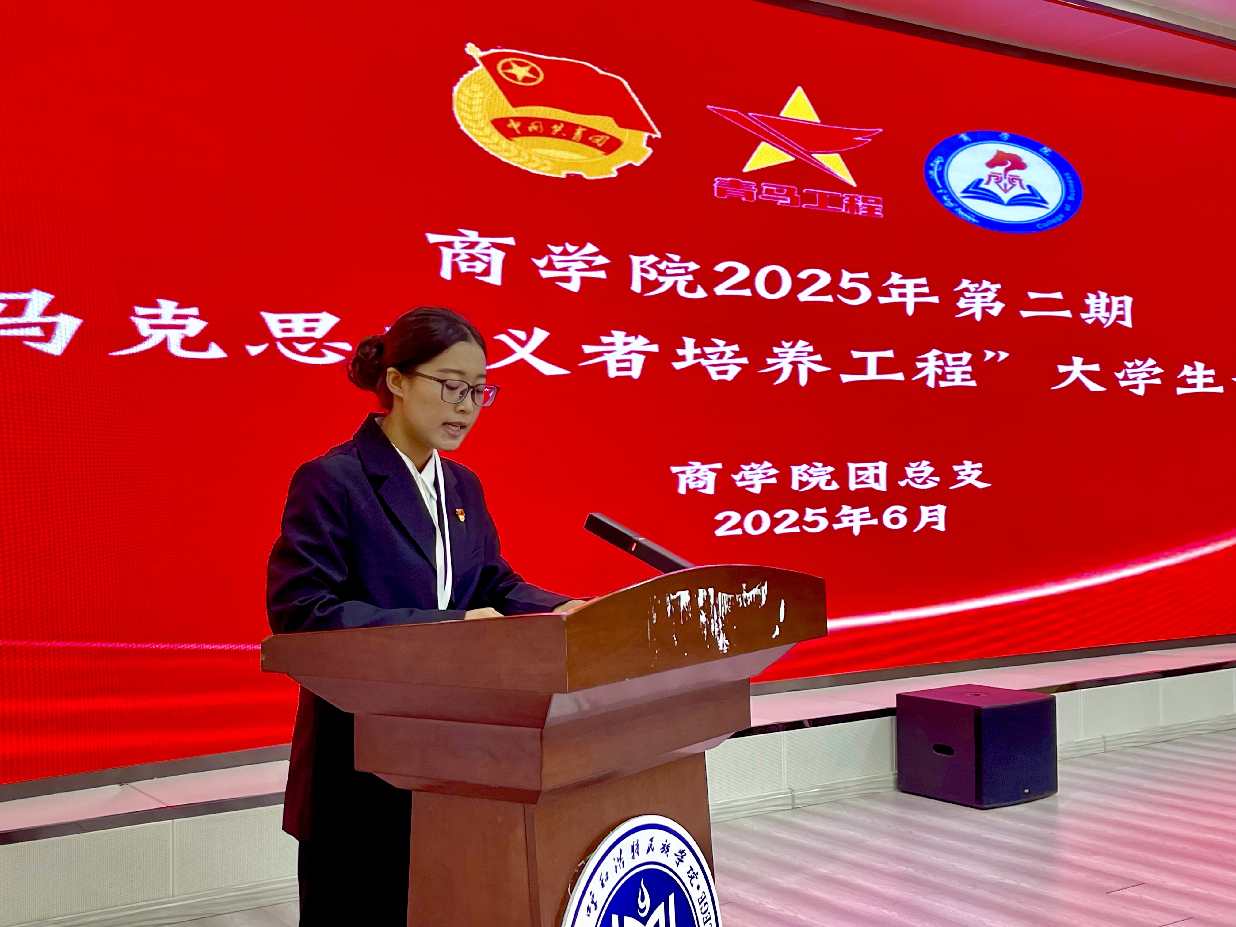 商学院党总支副书记郭晶致辞,她指出要坚持用马克思主义科学理论武装青年头脑引导学员树立共产主义远大理想和中国特色社会主义共同理想突出理想信念教育和实践教育,不断为党输送优秀青年政治骨干,并希望同学们通过青马工程的学习,深刻领悟马克思主义真理力量,将个人理想融入党和国家事业发展大局。