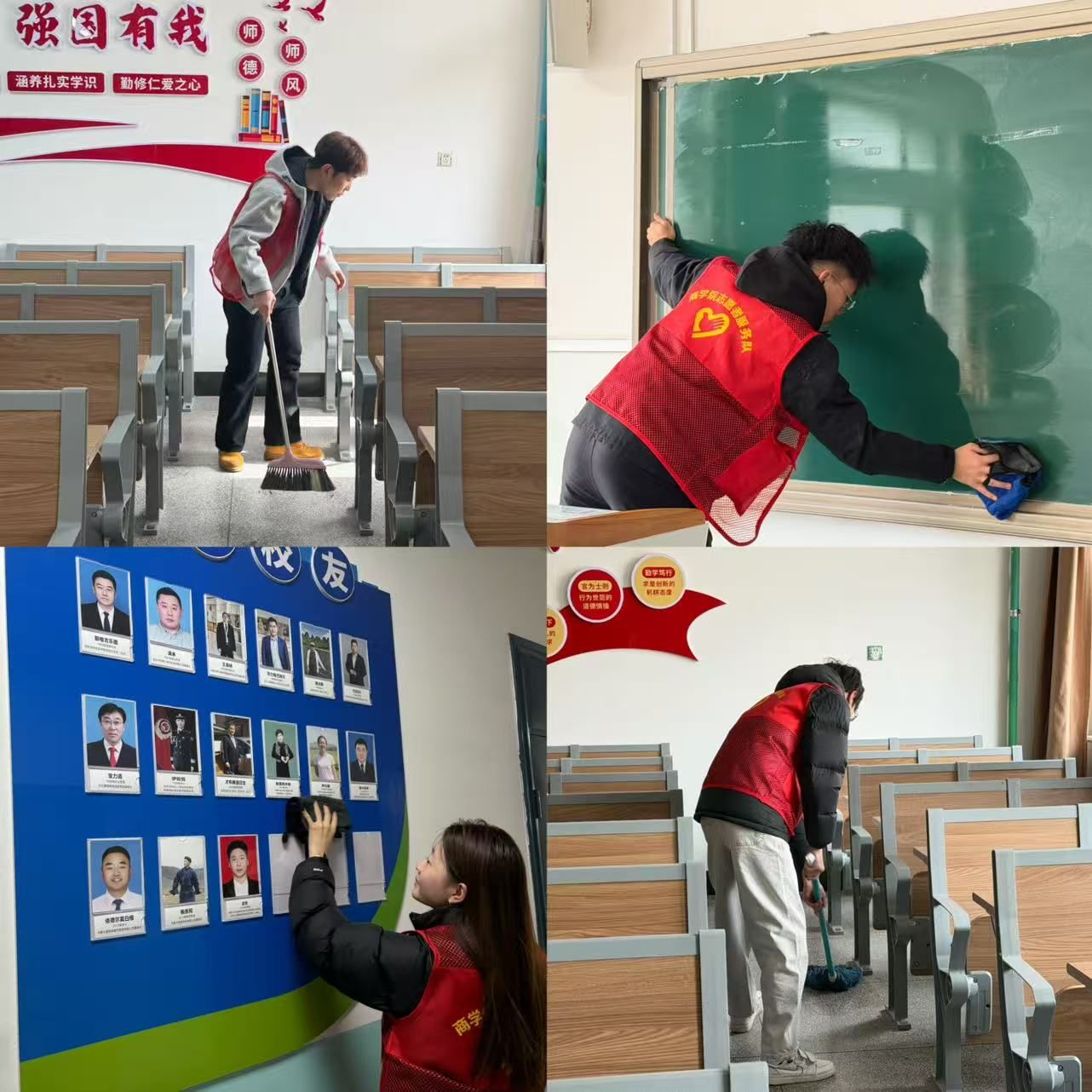 活动期间,志愿者对学院办公区和学院教室进行了全面的卫生清理,着重针对卫生死角、污渍、杂物、课桌缝隙等重点区域,认真清扫垃圾、擦拭门窗桌椅、整理物品,清除积存的杂物和环境盲区。为师生营造了舒适的教学办公与学习环境。