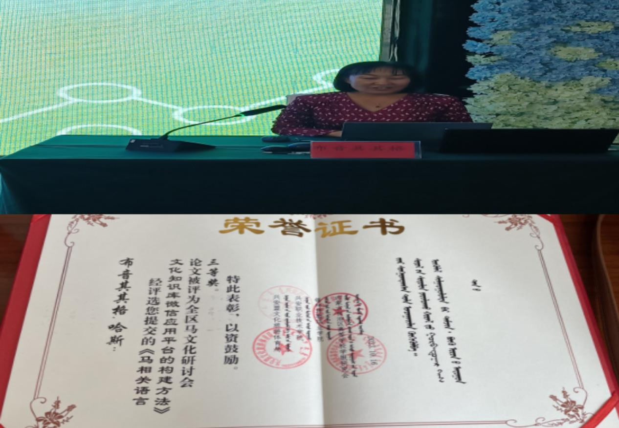 我院教师布音其其格参加全区马文化研讨会,并提交的论文“马相关语言文化知识库微信应用平台的构建方法”被评为全区马文化研讨会三等奖,并在大会上宣读了论文。