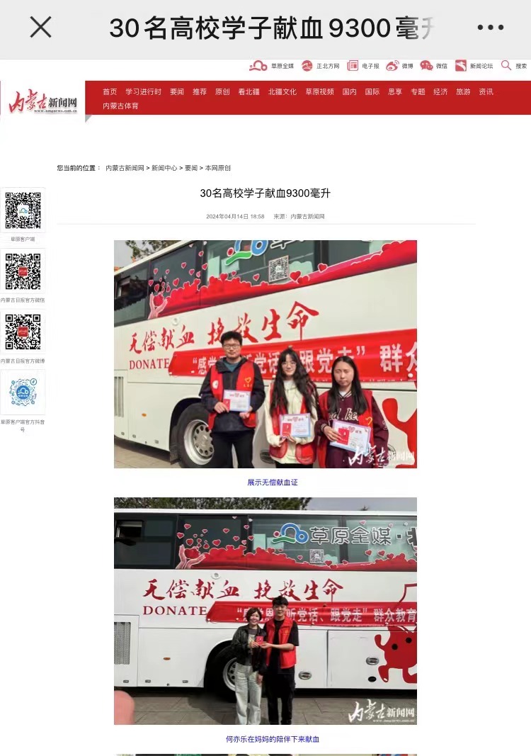 4月14日、beat365英国官方网站经济管理学院内蒙古工业大学电力学院共计50人走进大召广场参加无偿献血活动,活动当天共30人成功献血9300毫升