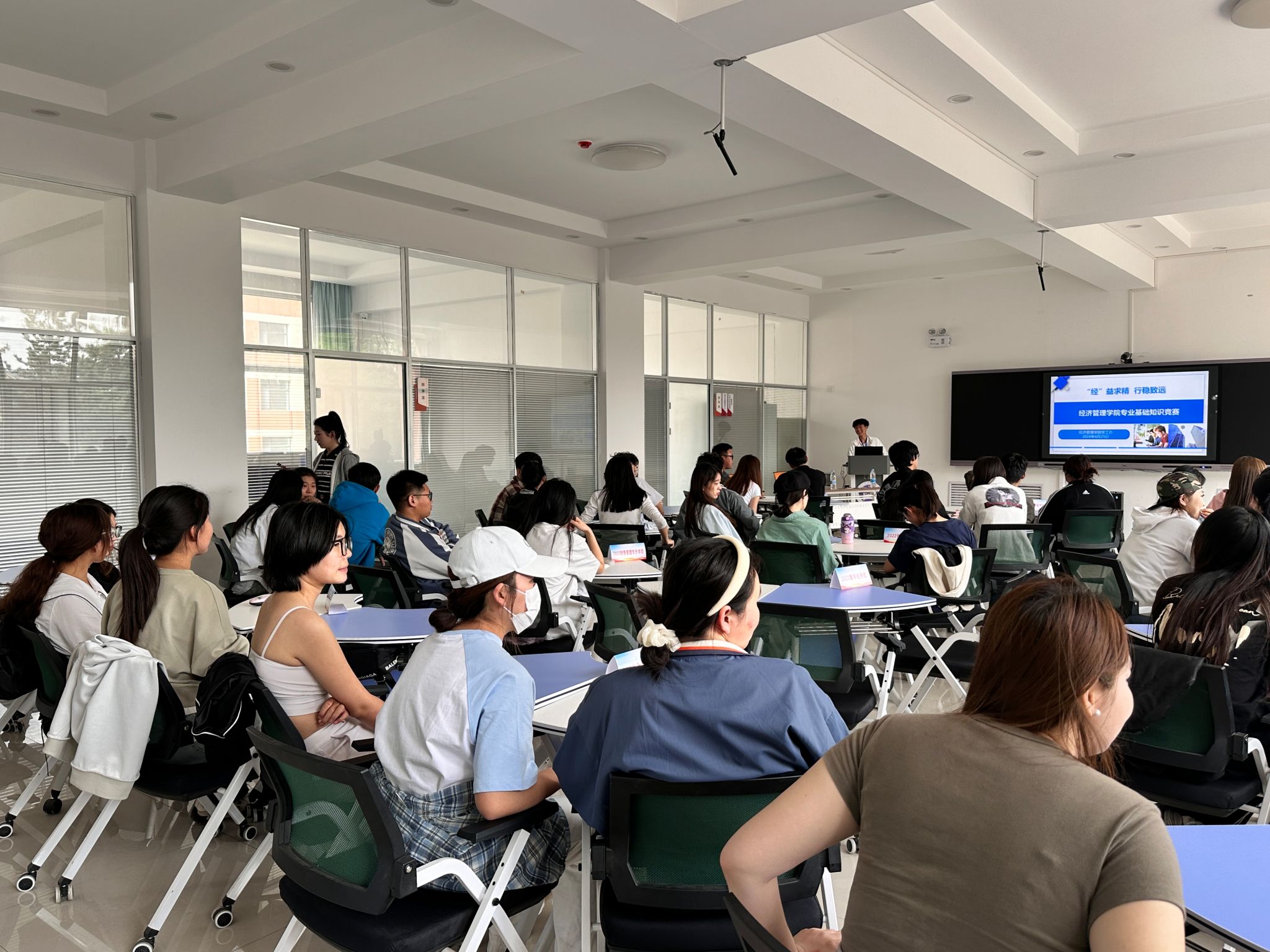 为切实贯彻教书育人、管理育人、服务育人的教育理念,进一步夯实专业基础知识,营造良好的校园文化氛围,增强学生的自我学习、自我提升意识,丰富大学生课外文化生活,加强我院的文化建设内涵,经济管理学院学工办以“‘经’益求精,行稳致远”为主题,于4月25日下午在创业楼二楼活动室举办学院第一届专业基础知识竞赛。全院非毕业班共组成16个队伍参赛,参赛选手共计48人。经济管理学院专任教师苏都、阿古达木,辅导员边雨桐、曹国利到场观赛。