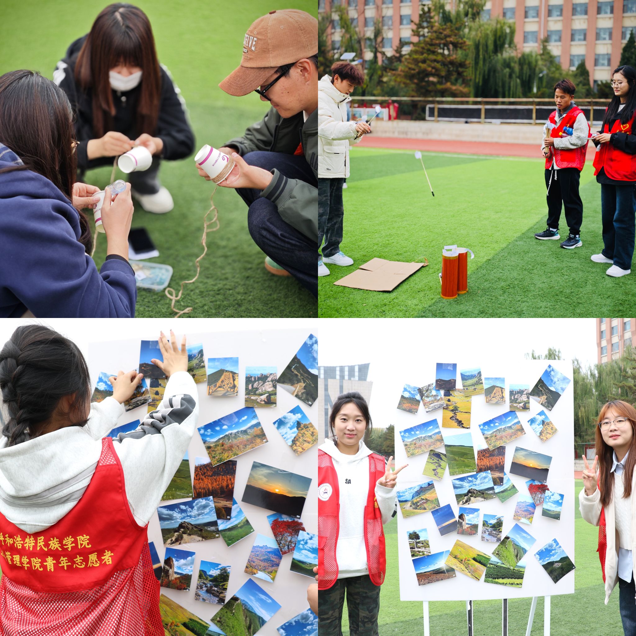 活动共设置了6个展览与游戏点位,分别是“环保普法拼接海报展览”“大青山风景照片墙”“环保普法拼贴”“正误投壶”“‘绿水青山’口令游戏”“手工生态瓶”等互动内容。