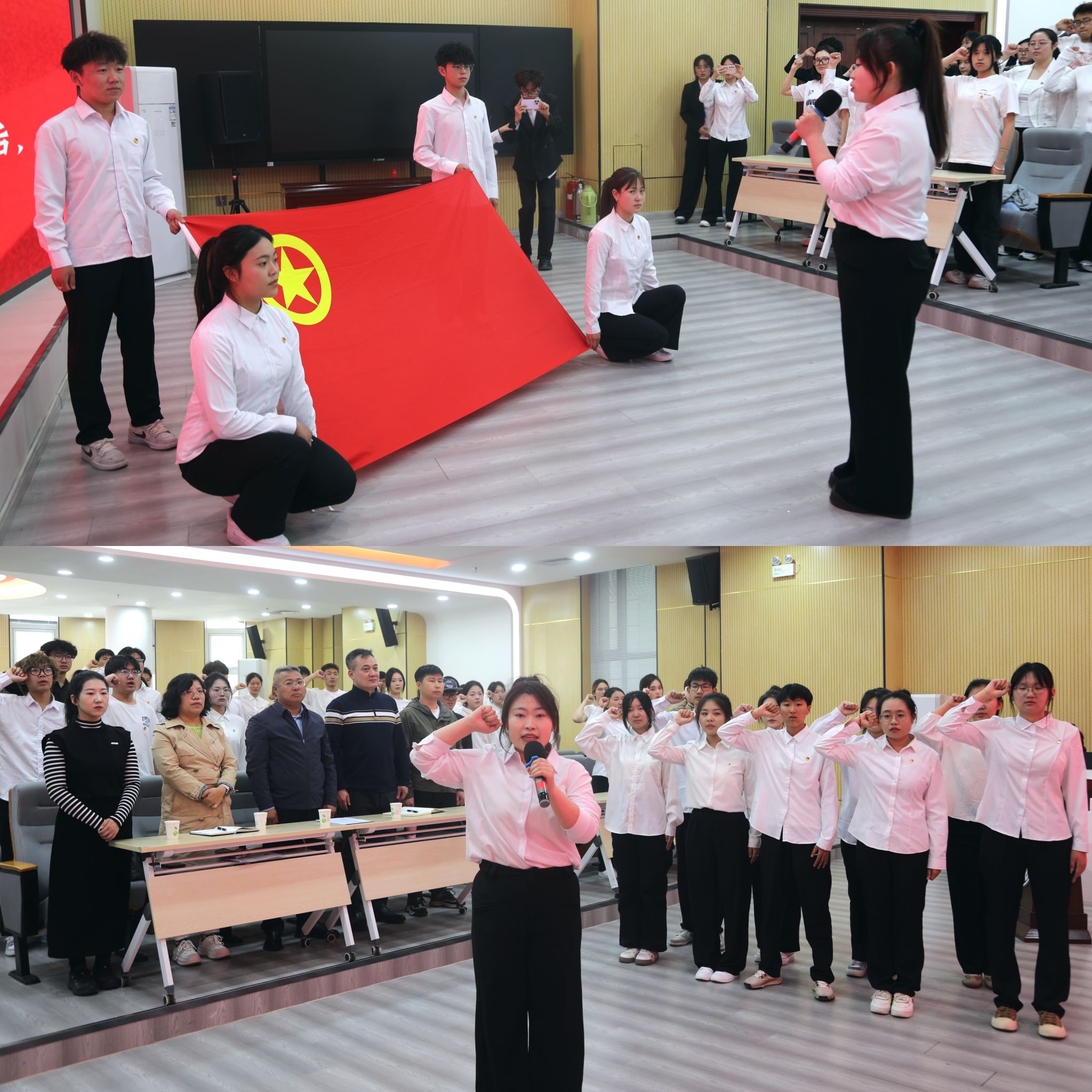在庄重的入团仪式环节,老团员为新成员佩戴团徽,全体团员重温入团誓词。新团员代表与获奖代表先后作表态发言。