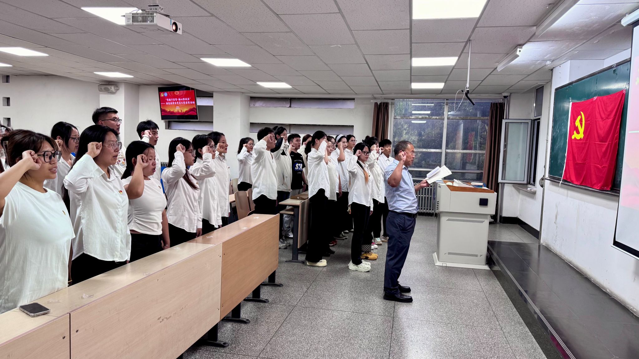 最后,在樊寒伟老师的领誓下,全体新党员面向鲜红的中国共产党党旗,高举右拳,庄严宣誓:“我志愿加入中国共产党,拥护党的纲领,遵守党的章程……”,这不仅是对党的忠诚承诺,更展现了新时代青年党员的坚定信念与昂扬风貌。