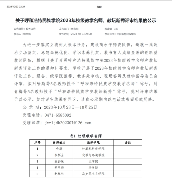 2023年10月23日,经过学校评审,我院哈斯老师获批“beat365英国官方网站教学名师”称号,为我院建设高水平师资队伍又添新彩。