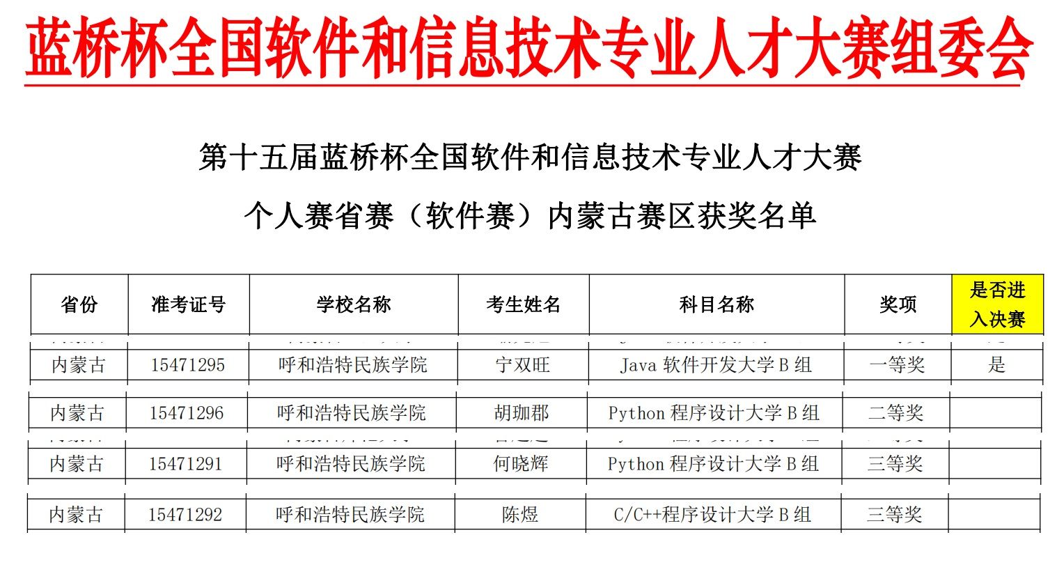 本届大赛分为个人赛和团队赛两大项,beat365官网选手参加了软件类个人赛,其中计算机科学学院的宁双旺同学荣获Java软件开发组一等奖,胡珈郡同学荣获Python程序设计组二等奖,陈煜同学荣获C/C++程序设计组三等奖,何晓辉同学荣获Python程序设计组三等奖的佳绩。宁双旺同学将代表学校参加第十五届“蓝桥杯”全国软件和信息技术专业人才大赛——个人赛国赛(软件类)。