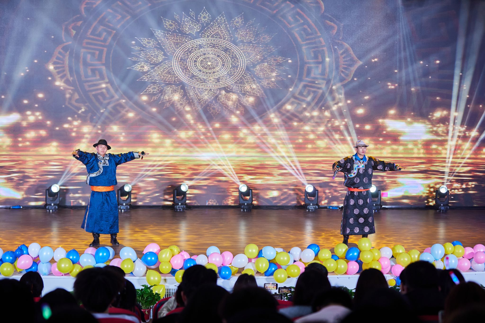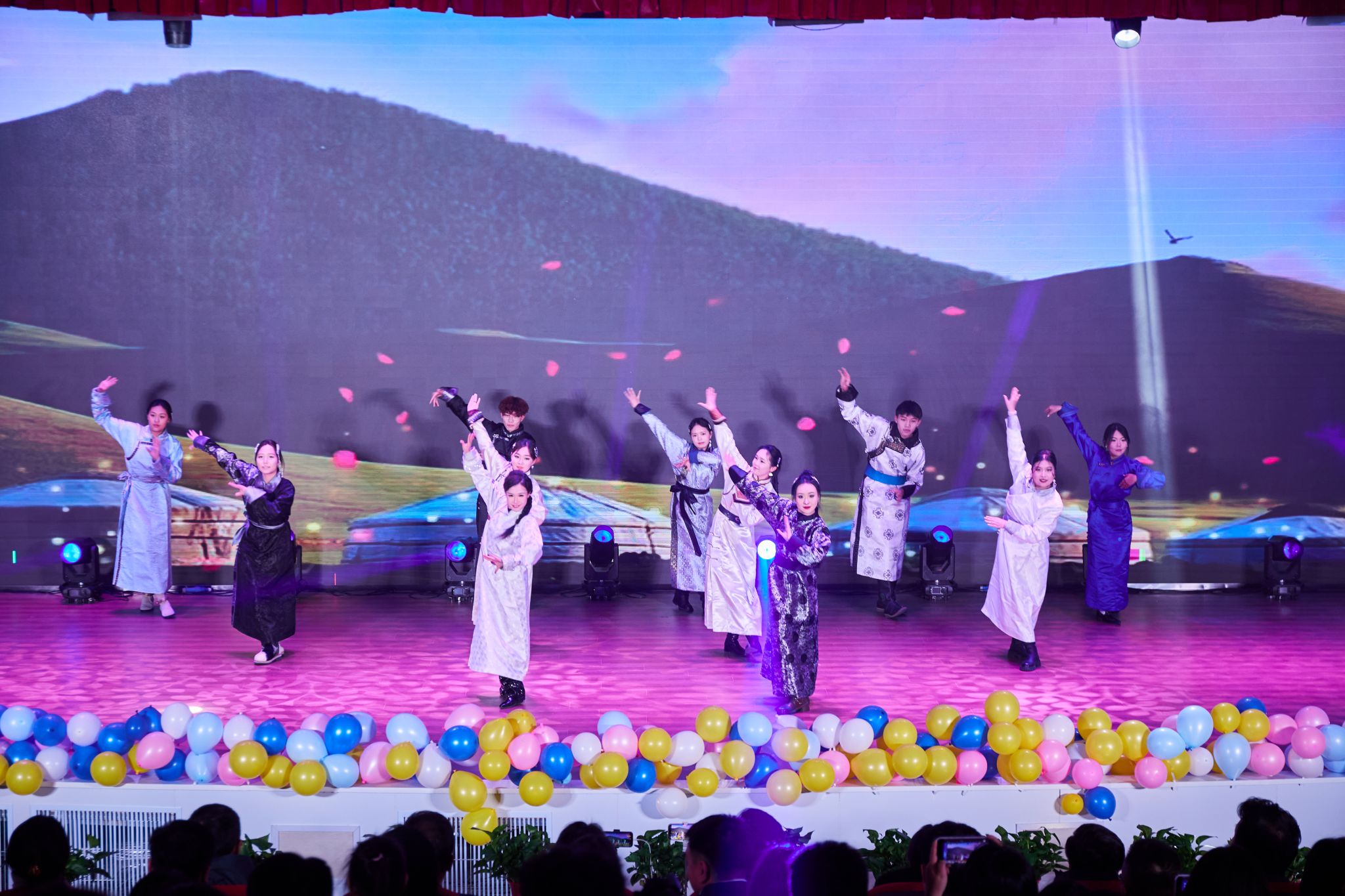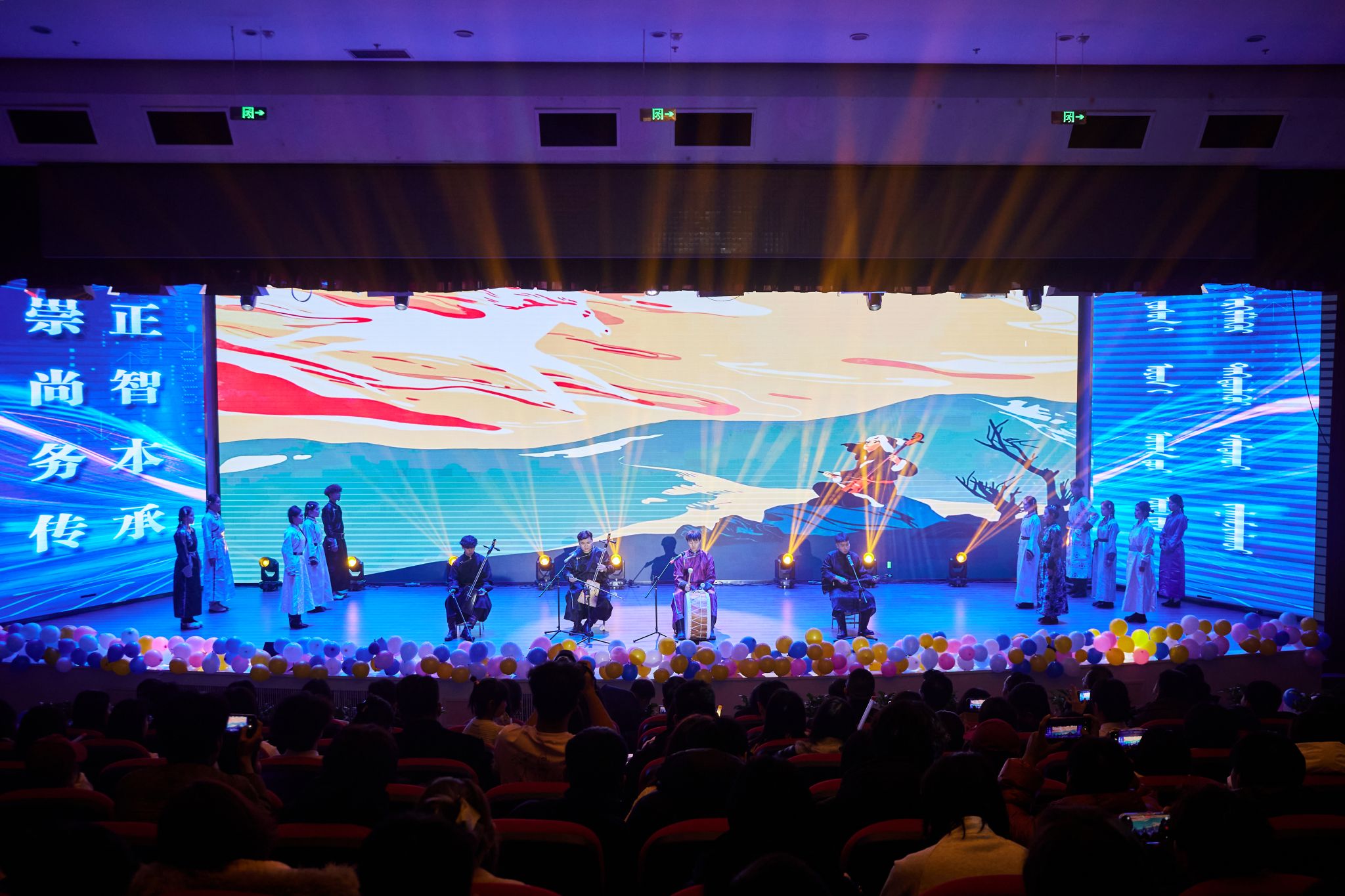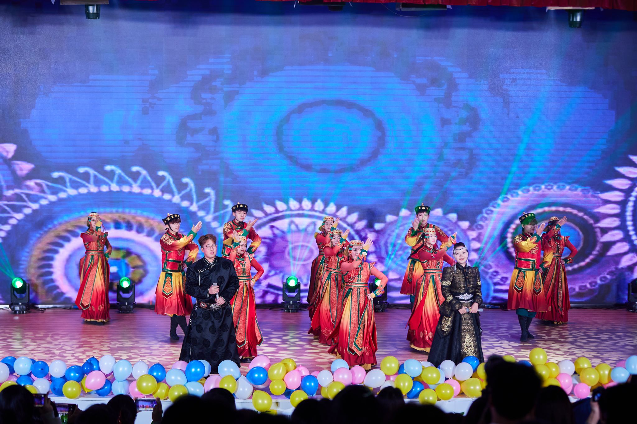晚会以呼麦、马头琴《快语》和民族舞《草原晨牧》拉开帷幕。随后节目轮番登场,京剧《霸王别姬》的水袖翩跹,让新生领略传统文化的雅致;相声《听学长说》以幽默口吻拆解校园生活“通关秘籍”,引得全场捧腹;乐队演绎的《斑马 斑马》、歌伴舞《万丽》则将青春张力拉满,蒙语歌曲的婉转旋律与民族舞《宴歌》的欢快舞步,更让地域文化气息浸润每一处角落。
