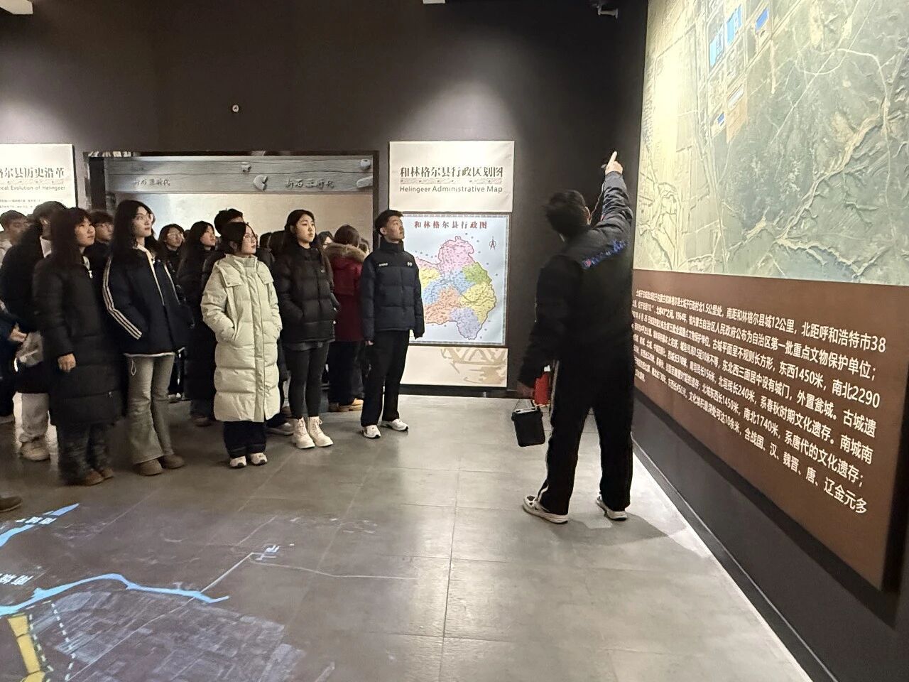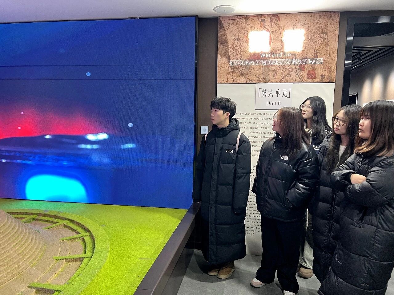 在博物馆讲解员的专业引导下,同学们依次参观了各个展厅。远古先民的石器工具,默默诉说着早期人类的生存智慧;鲜卑族的金饰、陶器与生活器具,生动再现了古代民族的生活风貌,将书本中抽象的民族融合历史变得鲜活可感;盛乐古城的复原场景、珍贵的壁画遗存,全方位展现了这座古城曾经的繁华盛景。